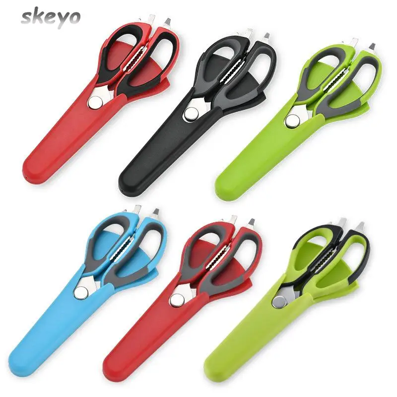Особенности:Может использоваться как обычные ножницы или отделять лезвия для использования в качестве ножей9 встроенных функций-ножницы, 2 ножа (средний и тонкий), зубчатые лезвия, открывалка для бутылок, консервный нож, Щелкунчик, Овощечистка, отвертка/Подъемник крышкиВысококачественные лезвия из нержавеющей стали, удобная ручкаМагнитный держатель, прикрепите к двери холодильника, чтобы ножницы всегда были близки к руке
