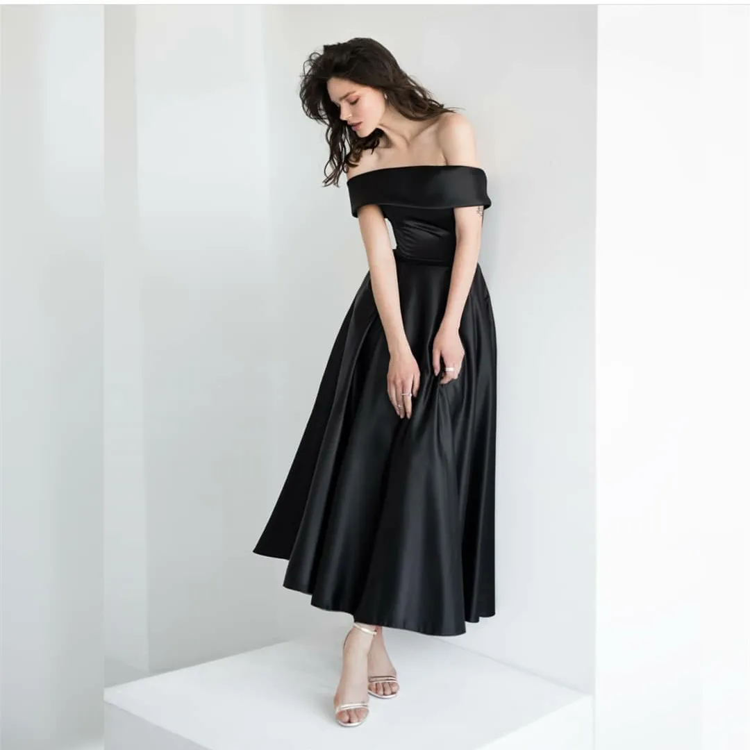 Элегантные короткие черные вечерние платья с открытыми плечами и карманами, атласное платье длиной ниже колена, официальное вечернее платье для женщин
