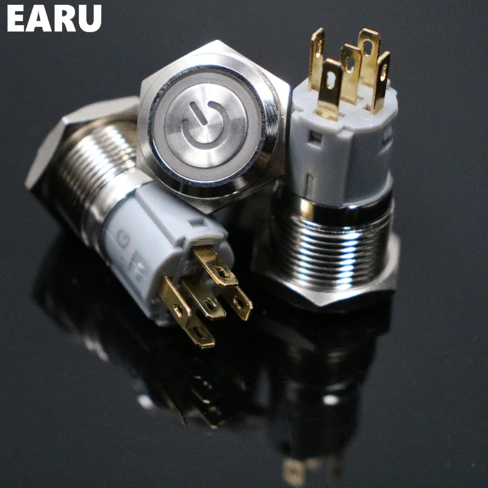 Водонепроницаемый металлический кнопочный переключатель, 16 мм, светодиодная лампа, фиксация фиксации, мгновенный запуск двигателя автомобиля, питание ПК, красный, синий, 5 В, 12 В, 3-380 В