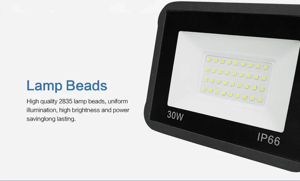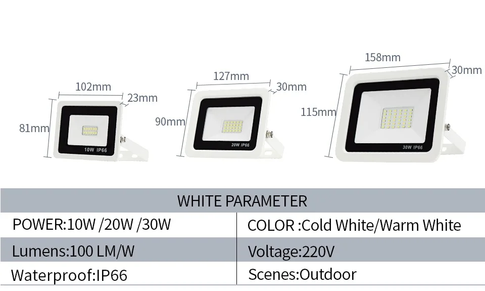 -Мощность: 10 Вт 20 Вт 30 Вт-Напряжение: 220 В переменного тока ~ 240 В-Угол луча: 120 градусов-C.T: холодный белый 6000-6500K/теплый белый 3000-3200K-Индекс цветопередачи: Ra>80-Светодиодный Тип: 2835 SMD-Гарантия: 1 год-Класс водонепроницаемости: IP66-Люмен: 100 лм/Вт-Срок службы: 50 000 часов