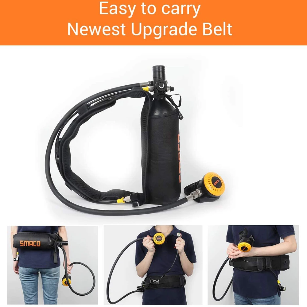 Smaco S400Pro mini scuba tank использует удлинительную трубку для подключения к манометру, что более удобно для нас, чтобы проверить манометр при погружении. В то же время наша оригинальная Портативная сумка-мессенджер была заменена на переносную поясную сумку. Вы можете легко носить с собой и освободить руки, чтобы сделать больше вещей под водой.
