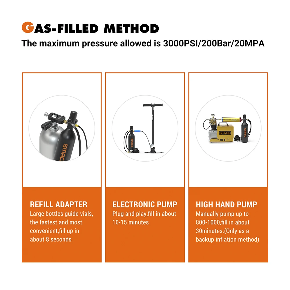 Вы можете использовать ручной насос высокого давления для надувания резервуара для Акваланга в любое время. (Обычно заполнение около 25-30 минут.) В то же время, вы можете использовать адаптер пополнения SMACO, большие флаконы направляющие флаконы, это самый быстрый и наиболее удобный метод, как правило, заполнение 1 литровый резервуар для дайвинга в течение 8 секунд. Если у вас есть электрический воздушный насос дома, он оставит вам больше времени и денег.