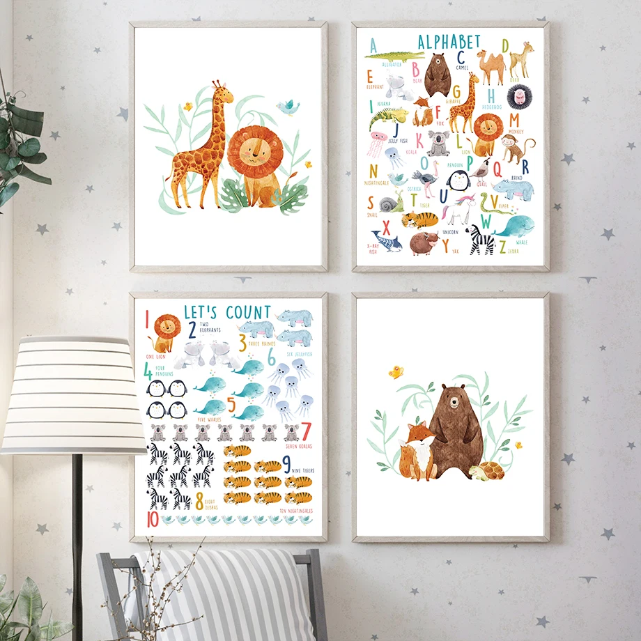Животные карта мира Алфавит цифры настенная Картина на холсте скандинавские постеры и принты детские настенные картины для декора детской комнаты