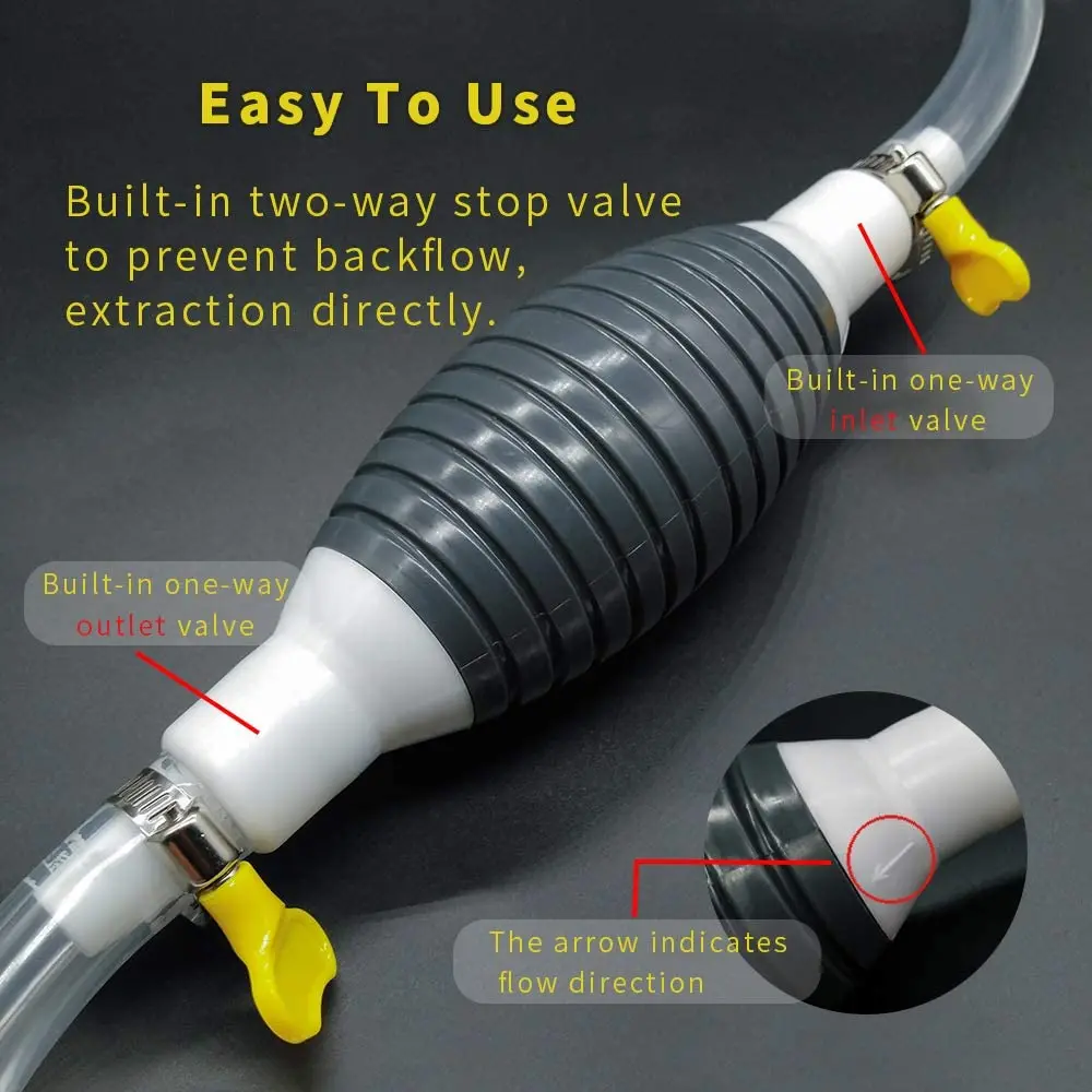 Резиновый ручной насос, который быстро начинает сифонный поток жидкости. Длинный и толстый прозрачный шланг из ПВХ устойчив к воздействию масла и высокой температуре. Он оснащен двумя желтыми фитингами, которые увеличивают герметичность шланга и шарового насоса, чтобы предотвратить боковую утечку.