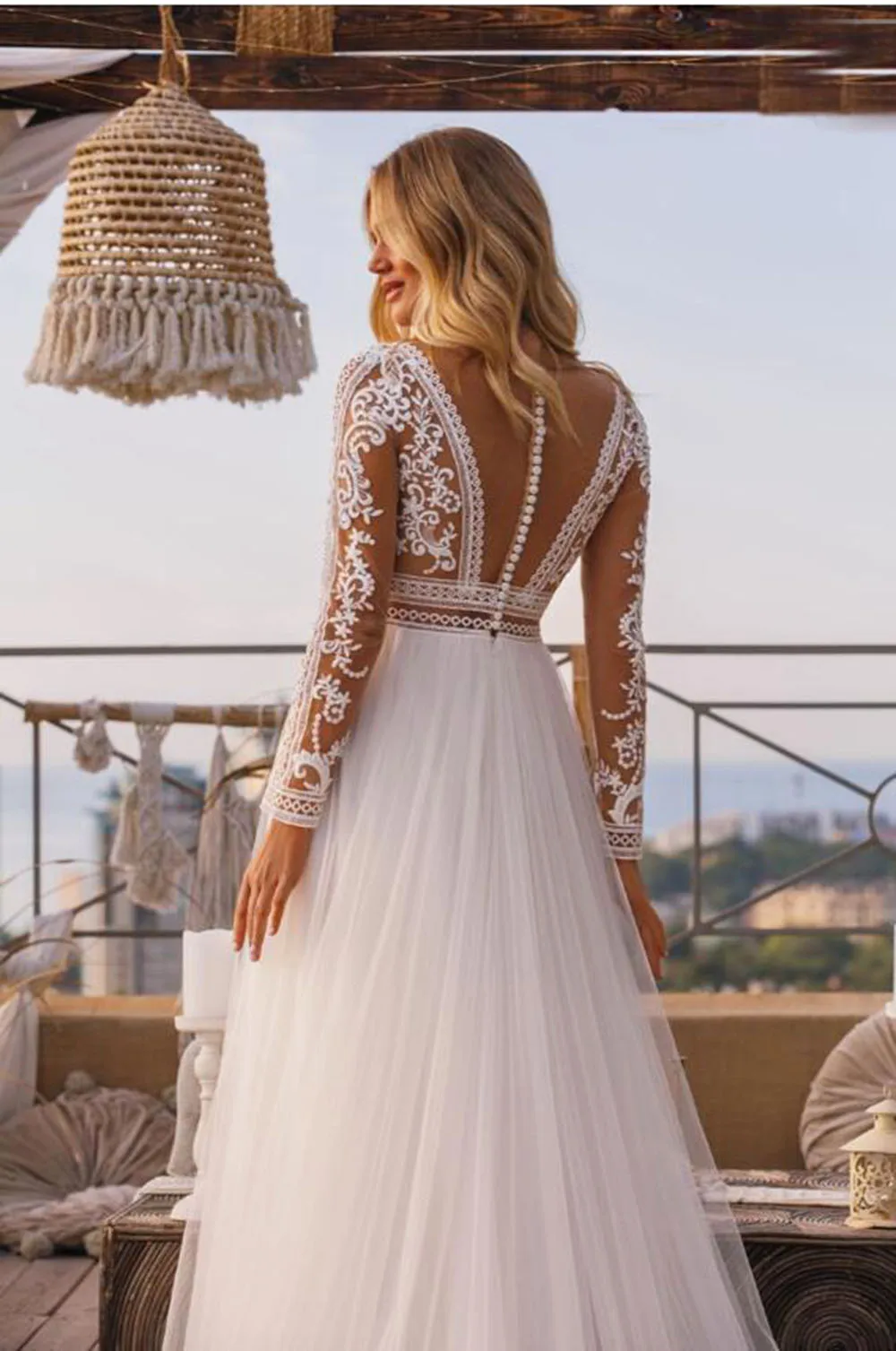 Свадебное платье с длинным рукавом, V-образным вырезом и кружевной ...