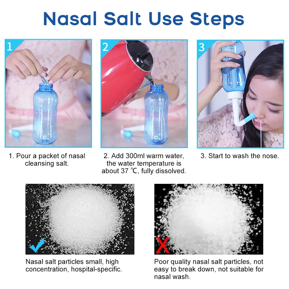 Растворите одну упаковку в 500 мл 37-40 градусов Цельсия, затем Промойте нос. Его можно использовать 2-3 раза в день или следовать советам врача.(4,5 г соли: подходит для 500 мл промыватель для носа2,7 г соли: подходит для 300 мл нети горшок2,25 г соли: подходит для 70 мл нети горшок)