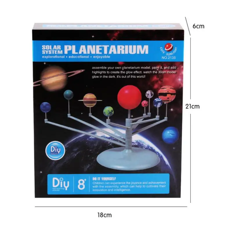 Содержит 3d-солнечную систему модель «планетарий», кисть, полосу красящих горшков, стенд с вращающимися дужками, стальными полосками, песочной бумагой, шаблон Кольца Сатурна и подробные инструкции.