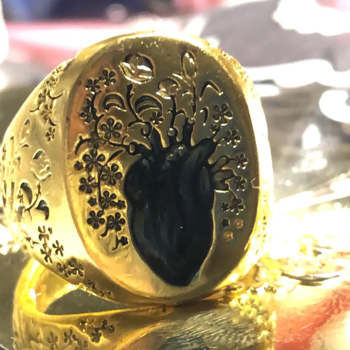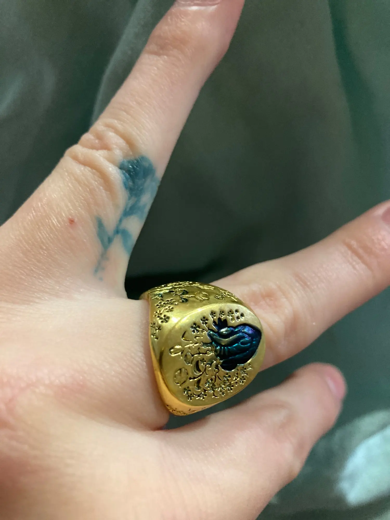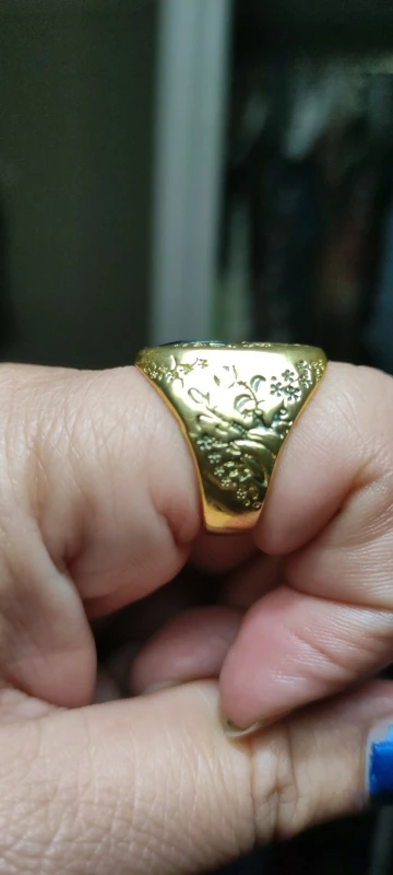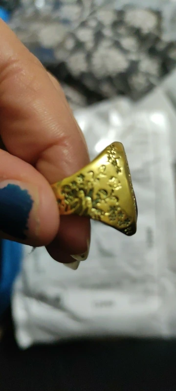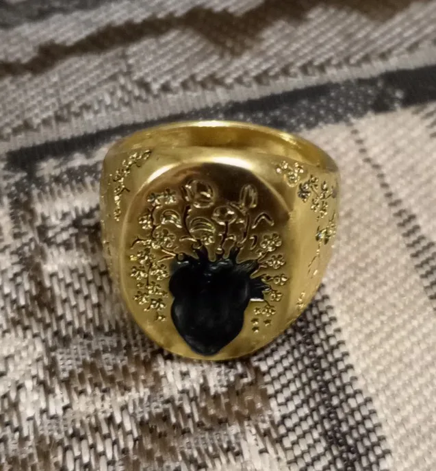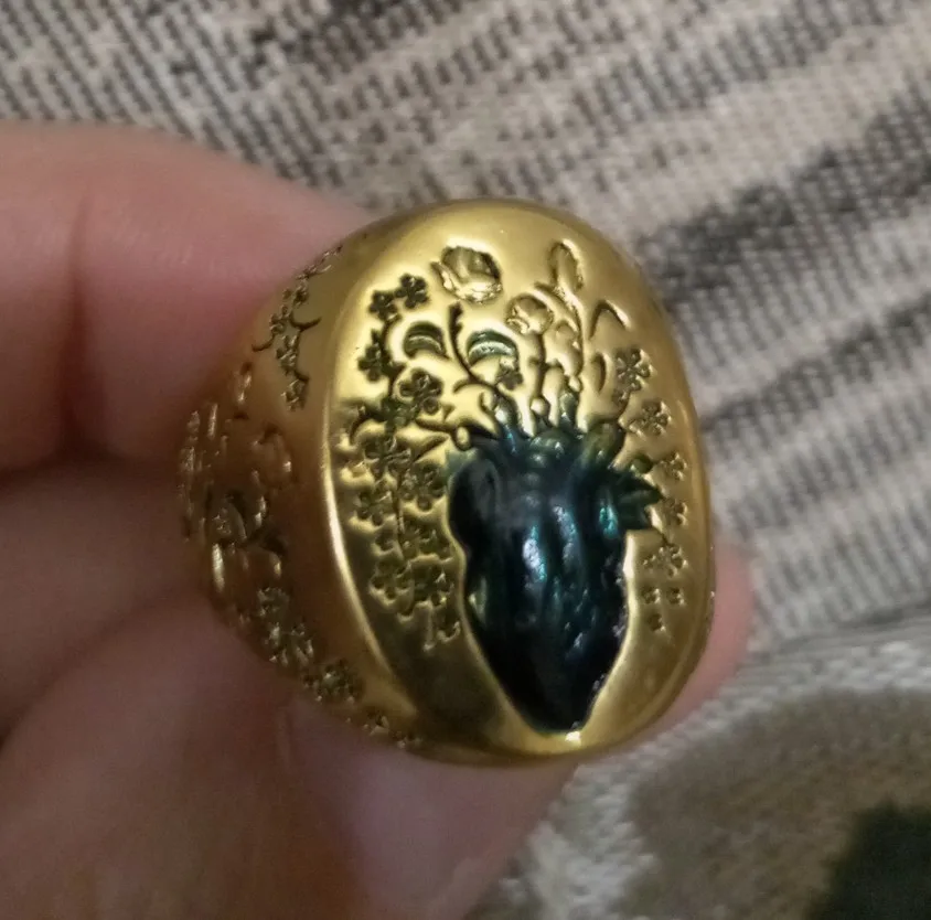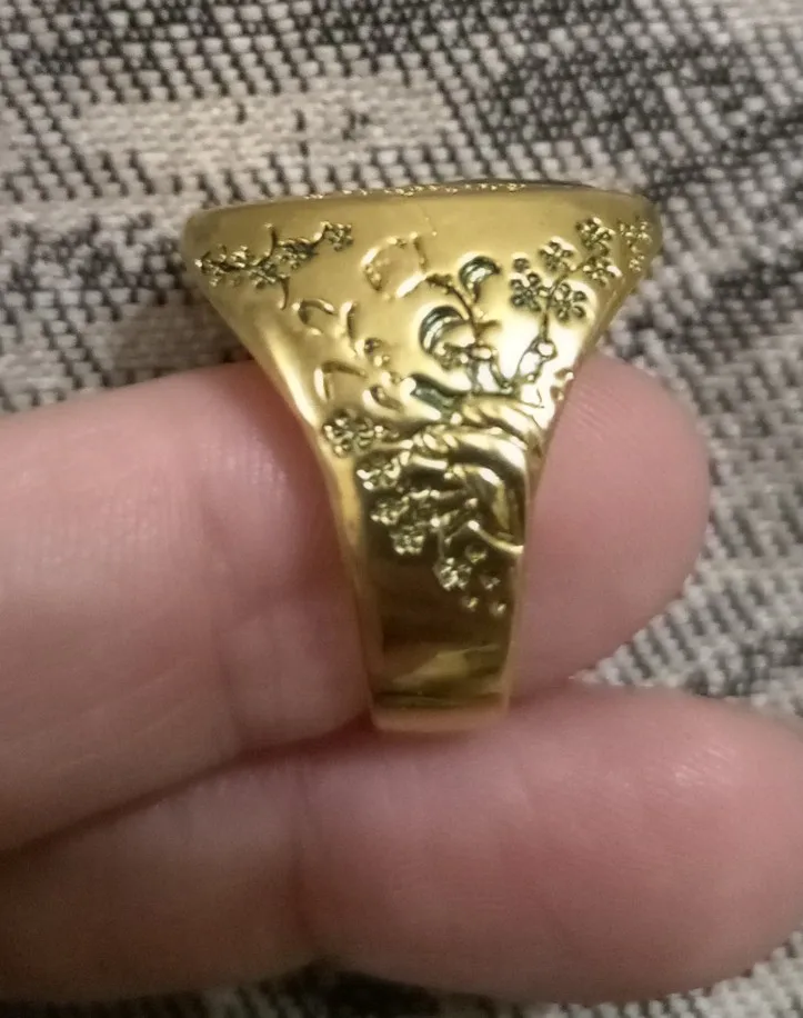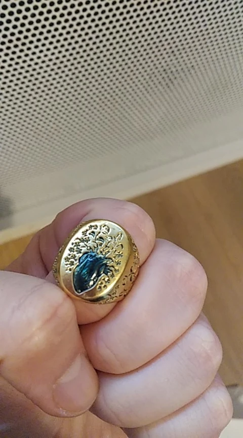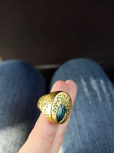 Я не рассчитывала за эти деньги получить аналог с фото продавца, и, несмотря на единственный минус - потекшую за контур сердца синюю краску, всё равно довольна тем, что получила. По бокам так же очень красивые рельефы цветов, да и в целом кольцо выглядит необычно. Но на очень тонкие пальцы самый маленький размер велик, только на большом удастся носить.