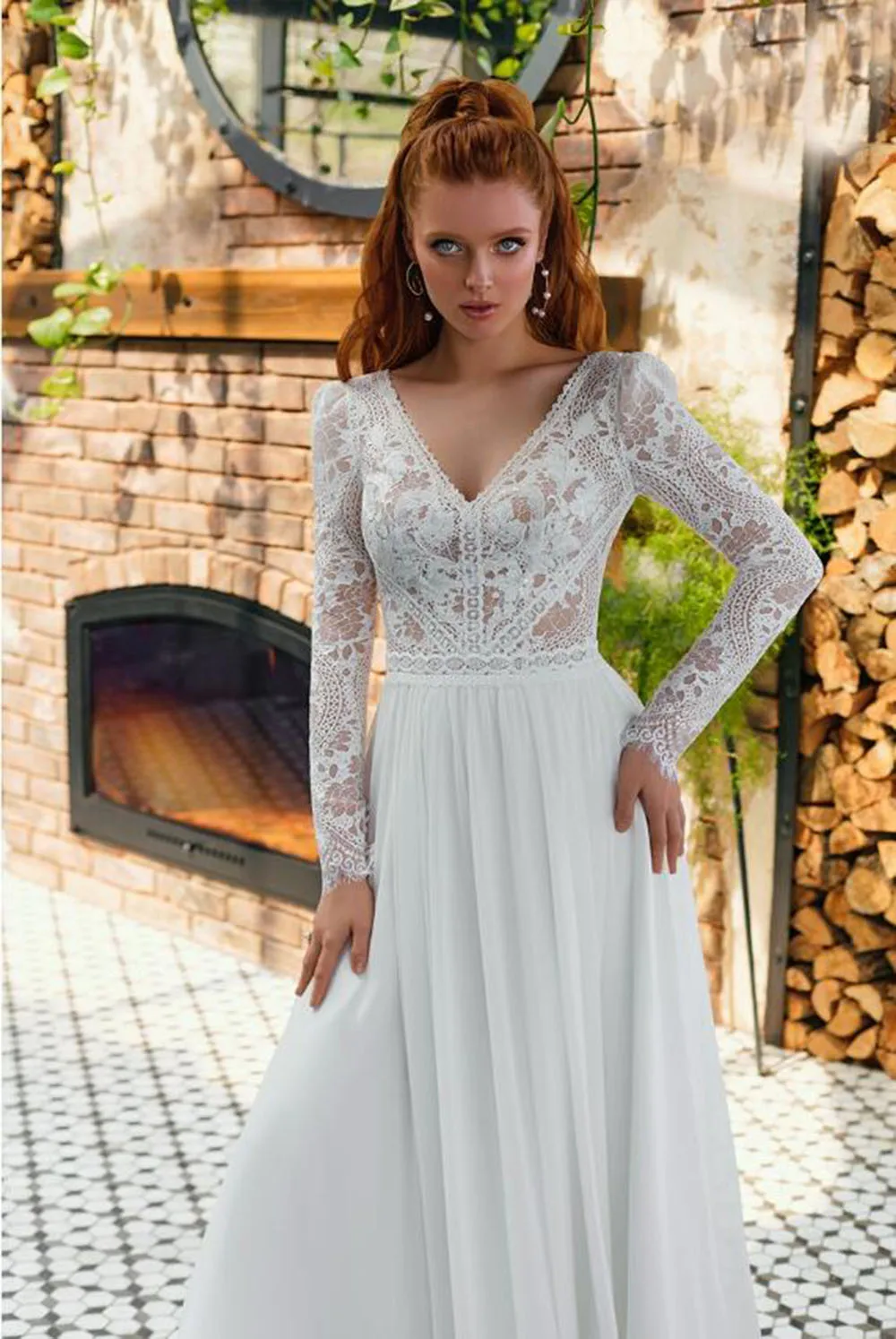 Свадебное платье с длинным рукавом, V-образным вырезом и кружевной ...