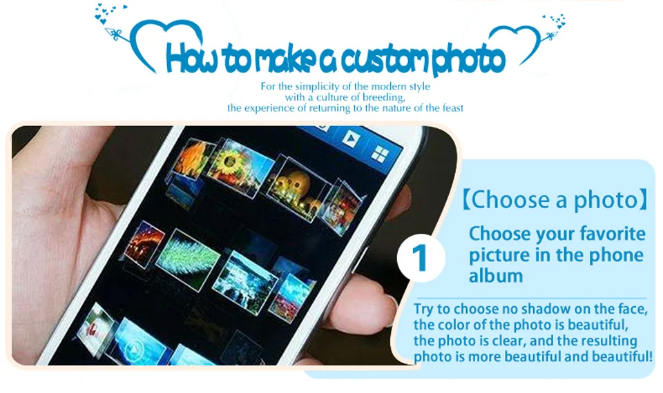 1. 【Выберите фотографию 】 Выберите свою любимую фотографию в альбоме телефона.2. 【Отправьте фото 】 свяжитесь с нами, отправьте нам выбранную вами картинку и сообщите нам размер.3. 【Посмотрите на эффективность 】после отправки фотографии, служба поддержки клиентов покажет вам эффект фото дизайна.4. 【Сделайте заказ 】 разместите заказ для оплаты, выбрав правильный размер. Мы завершим производство в течение 3 дней.