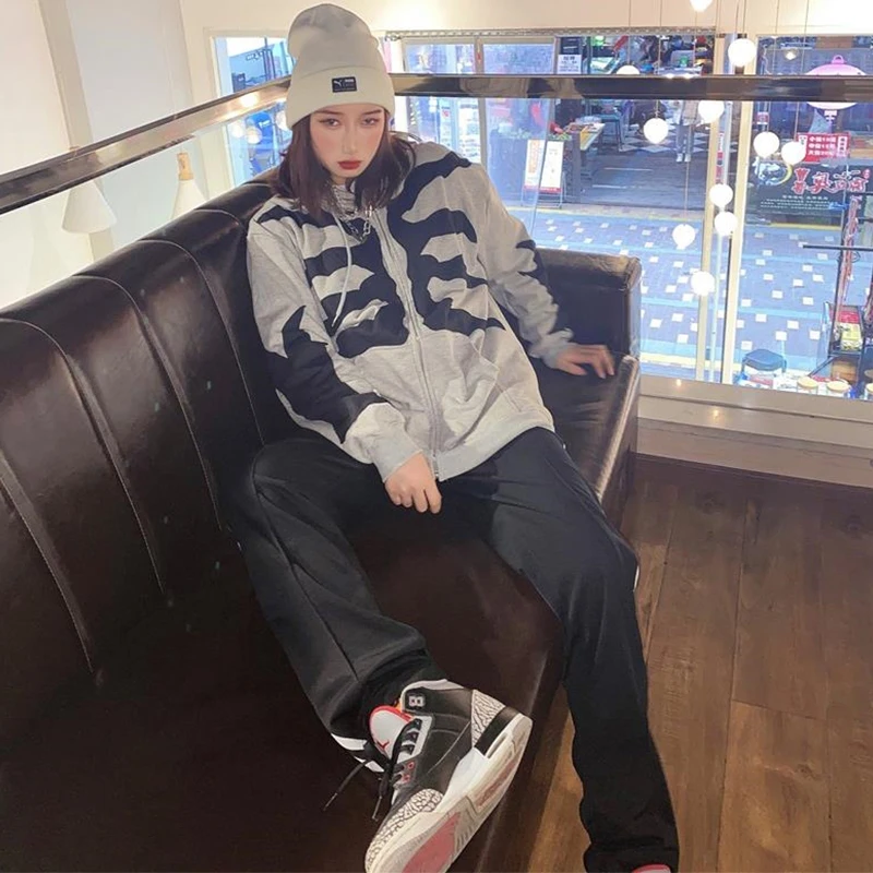 Толстовка Y2K в стиле Харадзюку, свитшот на молнии в готическом стиле с принтом черепа, Свободное пальто с длинным рукавом и капюшоном, однотонная кофта в Корейском стиле ретро