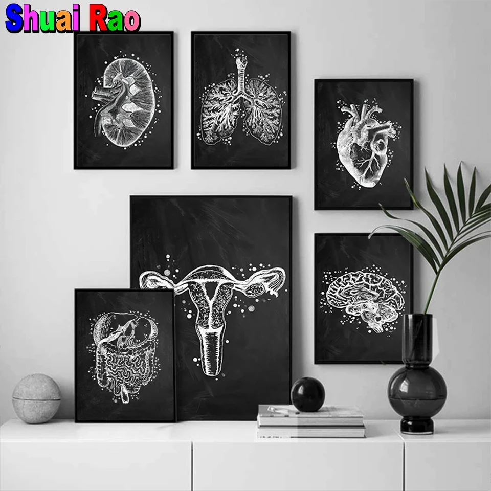 Алмазная живопись Анатомия человека, винтажная мозаика сделай сам из черных и белых органов, полноразмерная Круглая Мозаика, подарок, декор для клиники
