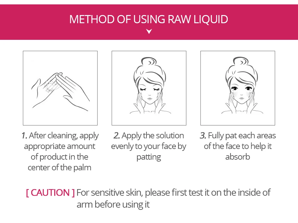 Метод использования сырой жидкости1. После очистки, нанесите соответствующее количество продукта в центре ладони,2. Равномерно нанесите раствор на лицо, похлопывая3. Полностью погладьте Каждый участок лица, чтобы помочь ему впитать[Внимание] для чувствительной кожи сначала проверьте ее на внутренней стороне руки перед использованием