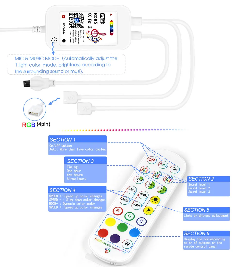 Контроллер: Tuya WiFi Smart Control ler + 24-кнопочный Пульт дистанционного управления (без аккумулятора)