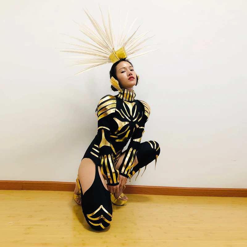 Зеркальный золотистый кожаный армированный костюм воина Stgae, ночной клуб Future Technology Sense Gogo, Одежда для танцев и представлений, Rave наряд 4147