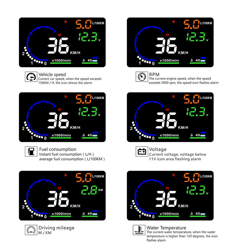Особенности: 1.HD проекция, безопасное вождение, одновременная проекция, нет необходимости опускать голову, чтобы узнать данные приборной панели. 2. Информация о множественном дисплее и состояние сигнализации: скорость, об/мин, температура воды, напряжение, одно расстояние вождения, Сигнализация низкого напряжения, сигнализация с высокой температурой воды, сигнализация с превышением скорости. 3. Многоцветная конструкция делает проекцию экрана более четкой, не боясь бликов, Нанотехнологии для устранения двойных отражений, четкости, как днем и ночью. 4. Легко установить, подключить и pla, нужно только подключить HUD с автомобильным OBD портом с помощью OBD кабеля, HUD будет отображаться, когда автомобильный двигатель ВКЛ/ВЫКЛ. 5. Автоматический переключатель: Включите и выключите с автомобилем, Защитите автомобильную батарею, вы также можете использовать ручной режим переключения. 6. Простота в использовании: щелчок вверх и вниз, длительное нажатие для переключения. 7. Автоматический режим регулировки яркости.