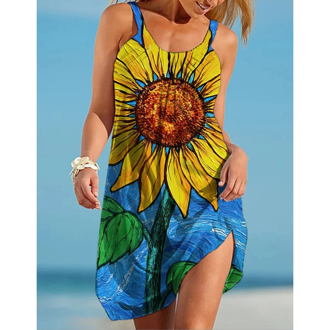 Женское пляжное мини-платье с принтом в виде попугаев и подсолнухов