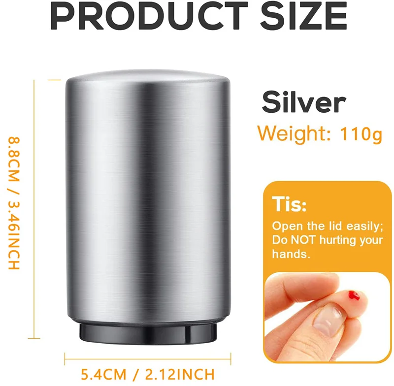 【Легко использовать 】: всего 3 шага: 1) поместите открывалку на бутылку; 2) Нажмите на открывалку вместе с бутылкой; 3) Освободите открывалку, И снимите крышку с бутылки;
