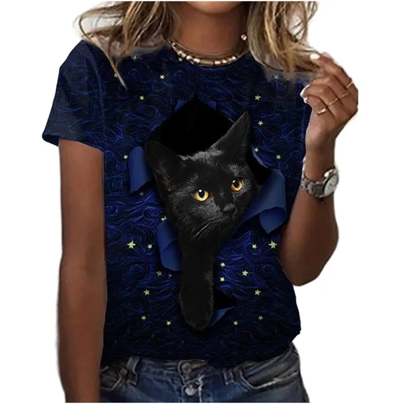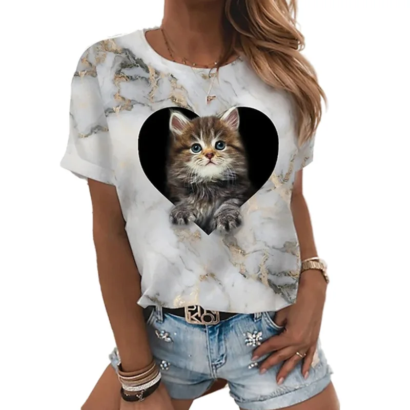 Летняя модная женская футболка с цифровым 3D принтом, футболка с коротким рукавом, милый топ с круглым вырезом и котом, свободный и удобный