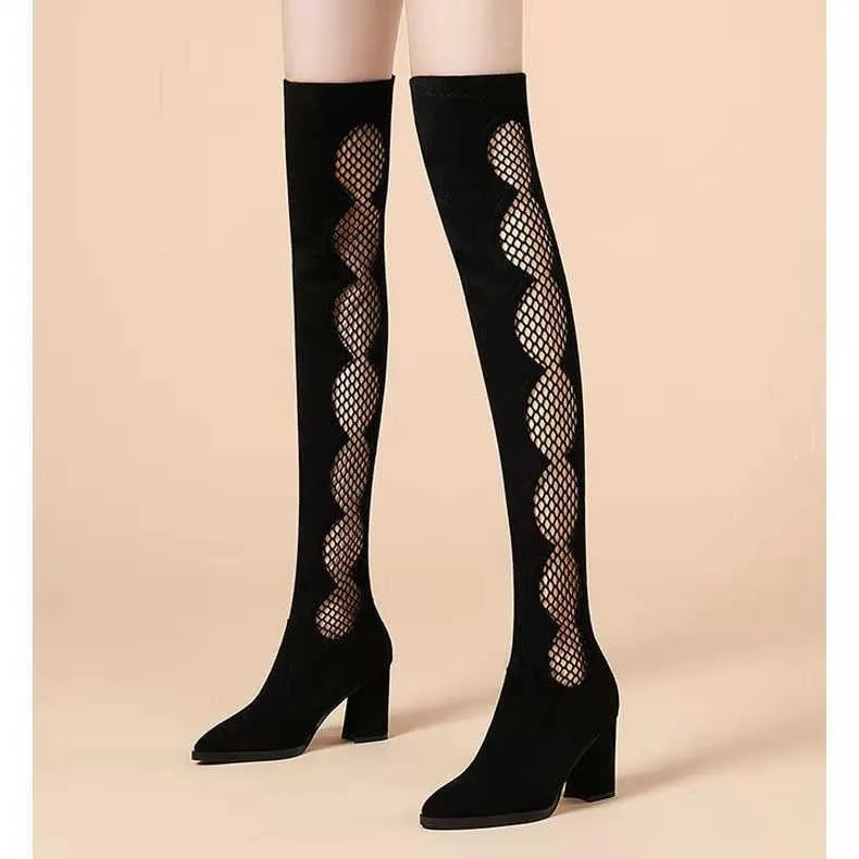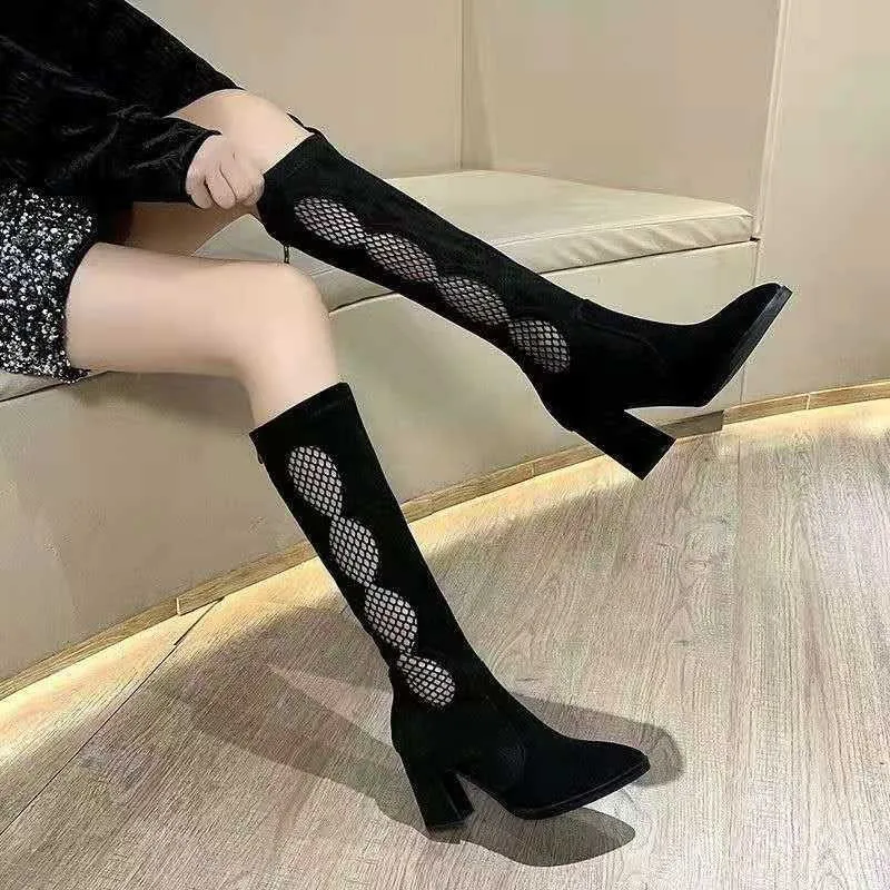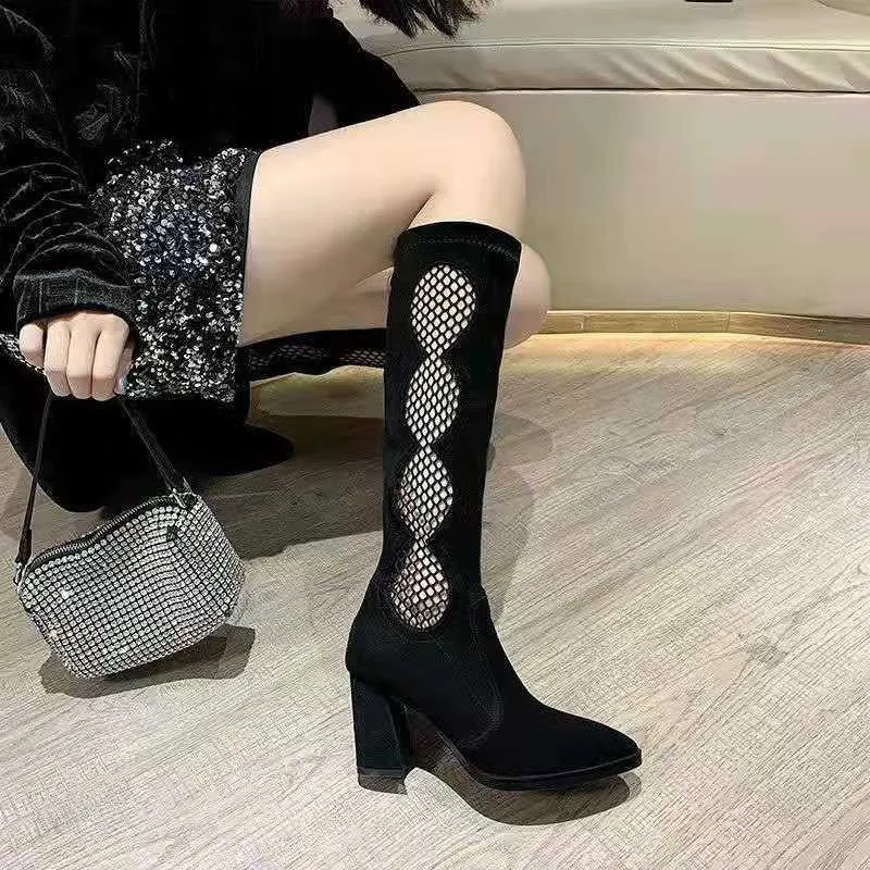 Женские сетчатые босоножки до колена, черные ажурные сандалии-гладиаторы на толстом каблуке, модель Лето 2022