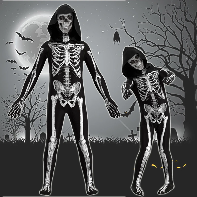 Хэллоуин Дети взрослый Скелет Череп костюмы страшный зомби косплей комбинезон