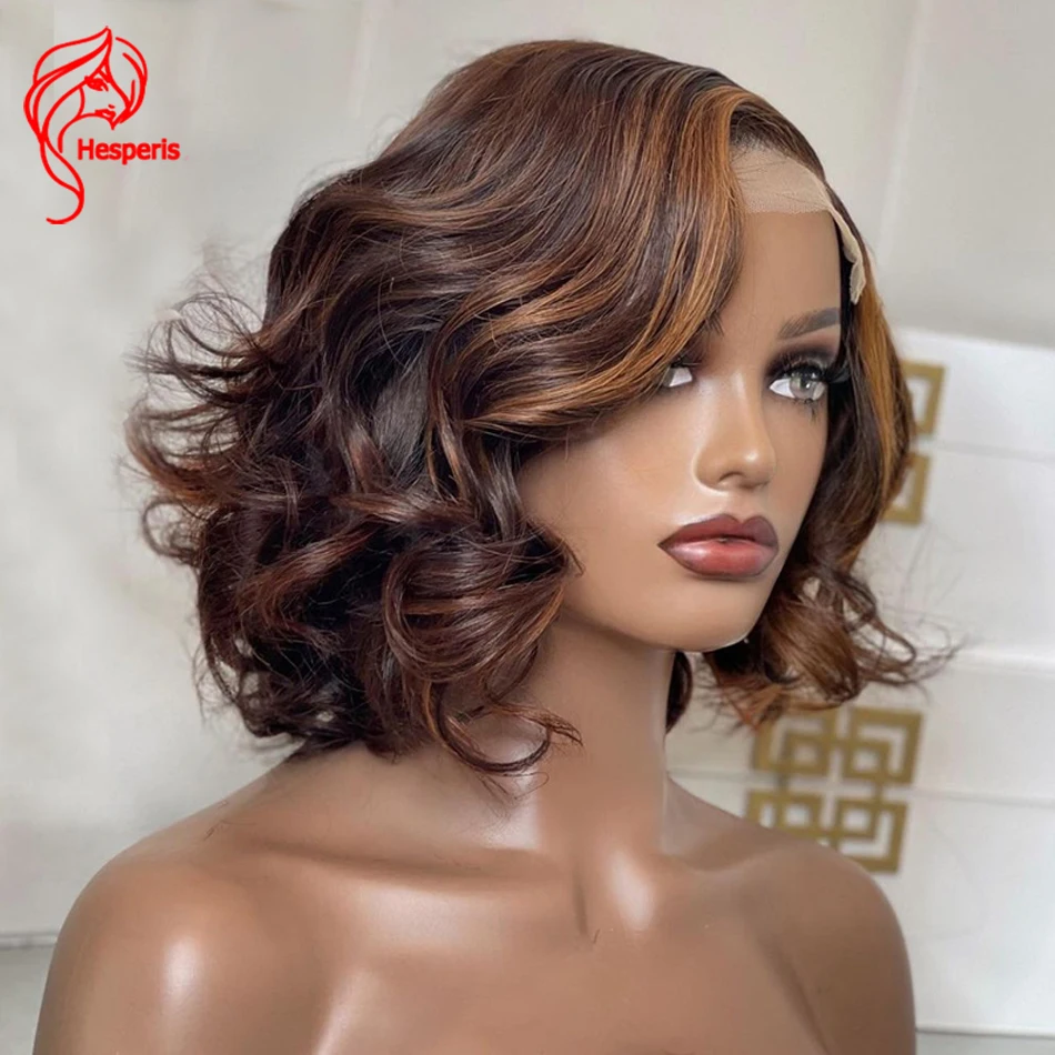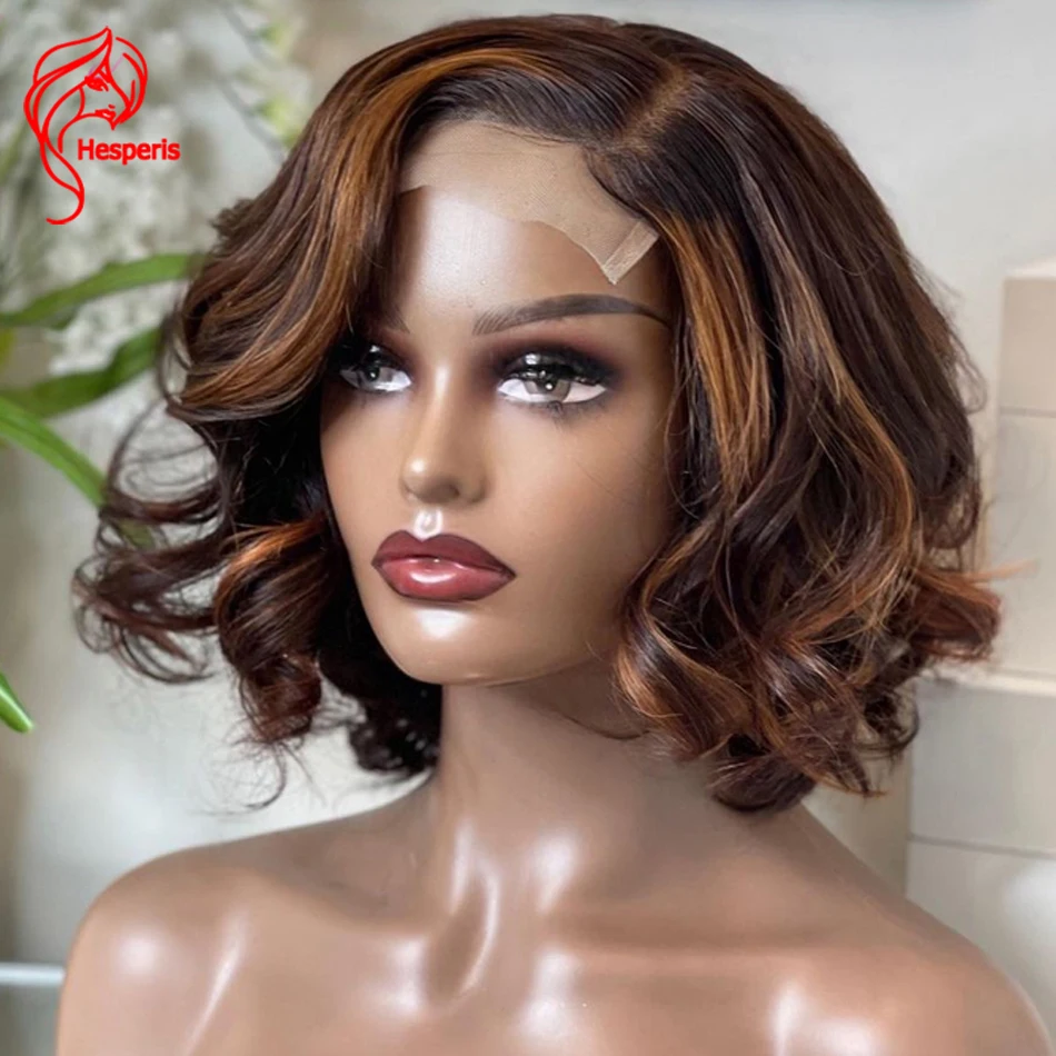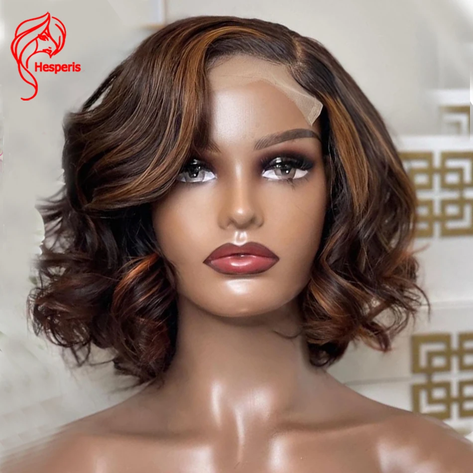 Hesperis хайлайтер шелковая основа кружевной передний парик из человеческих волос для черных женщин Бразильские короткие волнистые волосы боб парики с боковой частью