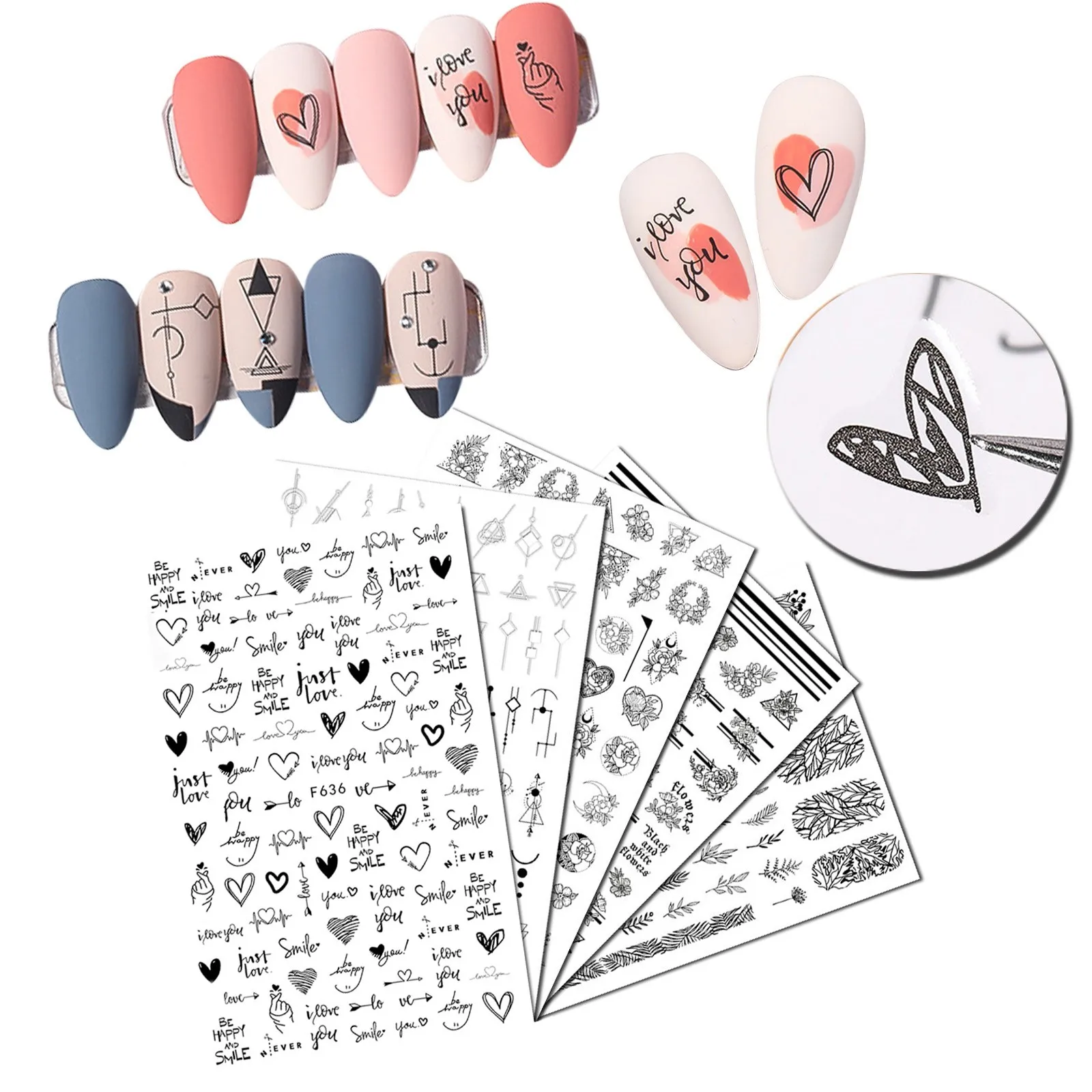3D наклейка для дизайна ногтей, черное сердце, любовь, самоклеящаяся наклейка-слайдер, маленькая свежая белая звезда, Персиковое сердце, украшение для ногтей
