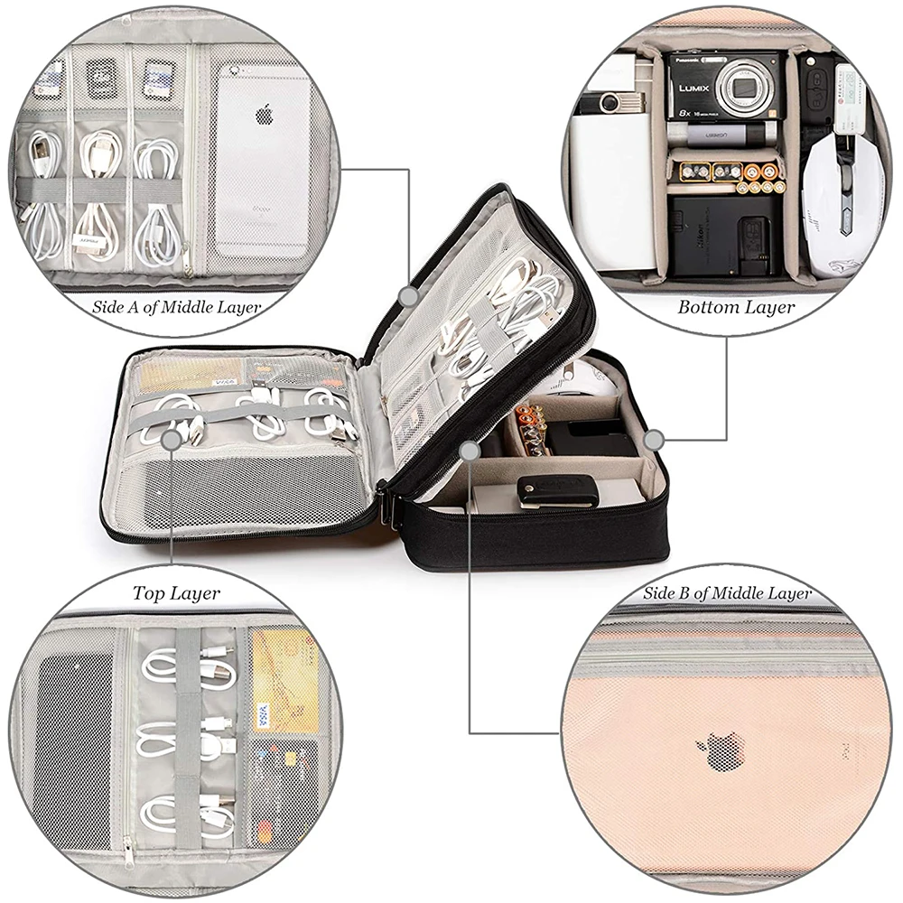2. С 1 большим карманом на молнии, 2 средними карманами на молнии и 5 мини-сегментов эластичной сетки, 6 эластичных петель и три отделения на липучке для разделения нижнего пространства, это 3-слойная электронная коробка вспомогательных приборов очень подходящее место кабели, адаптеры для мобильных телефонов, зарядные устройства, провода, портативные зарядные устройства, беспроводной гарнитуры, циклическая запись, SD карт для хранения данных, мыши, Беспроводные зарядные колодки, шнуры питания, умные часы и все маленькие электронные устройства, которые вам нужны.
