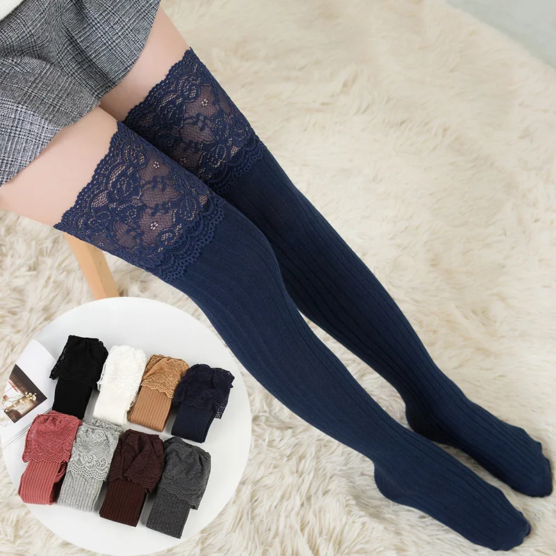 Соблазнительные теплые длинные чулки, модные кружевные полосатые гольфы, женские хлопковые чулки до бедра выше колена, колготки для кавайных дам