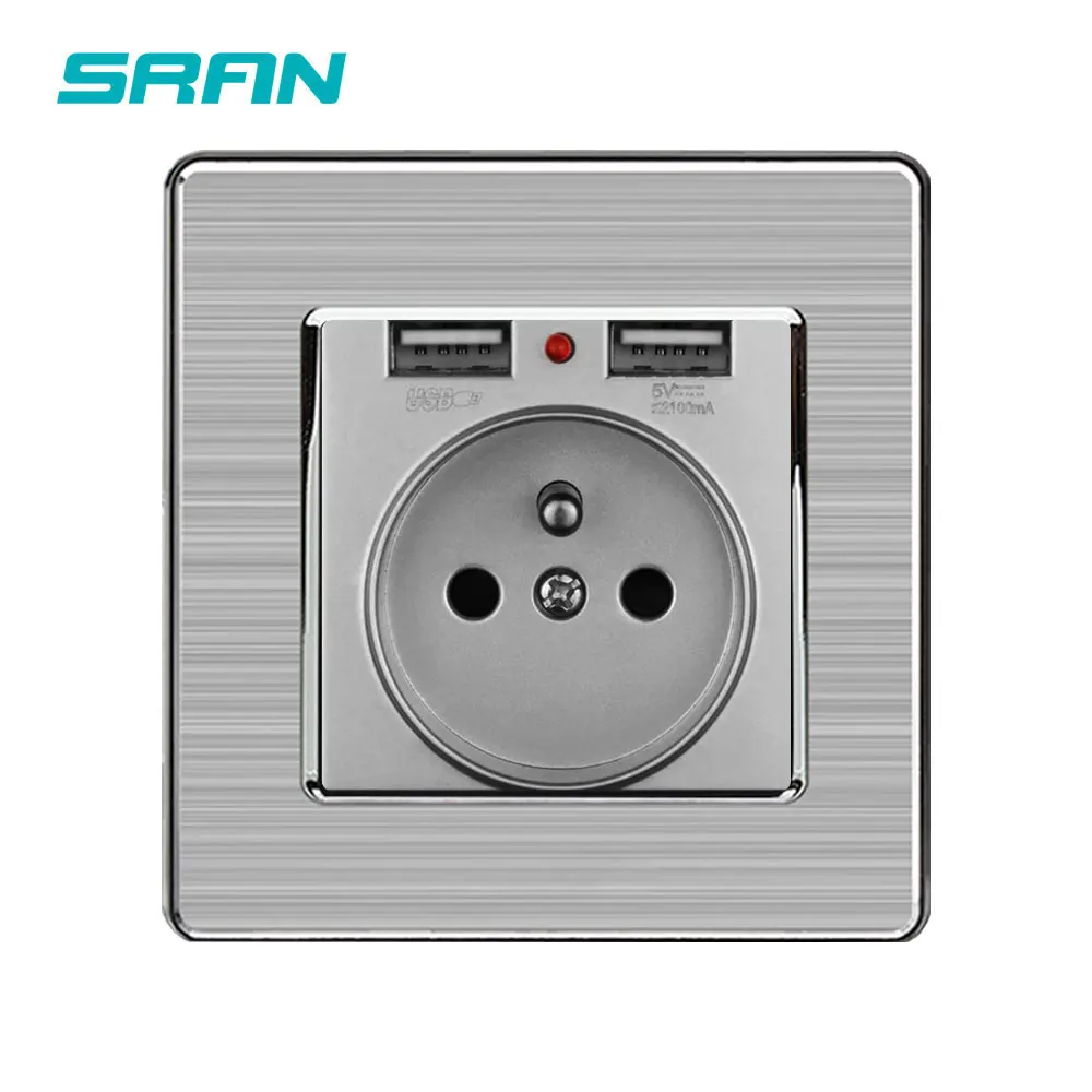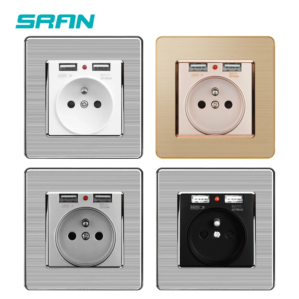 Настенная Французская электрическая розетка с USB,2USB выход 2.1a панель из нержавеющей стали гальванизированная Серебристая 86 мм * 86 мм черная