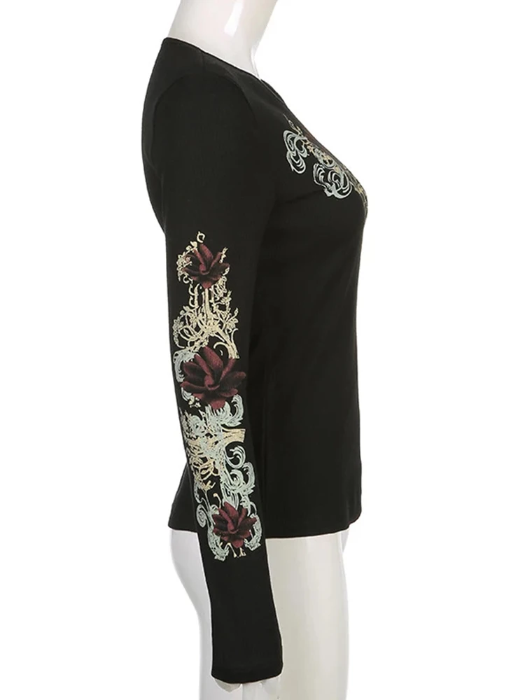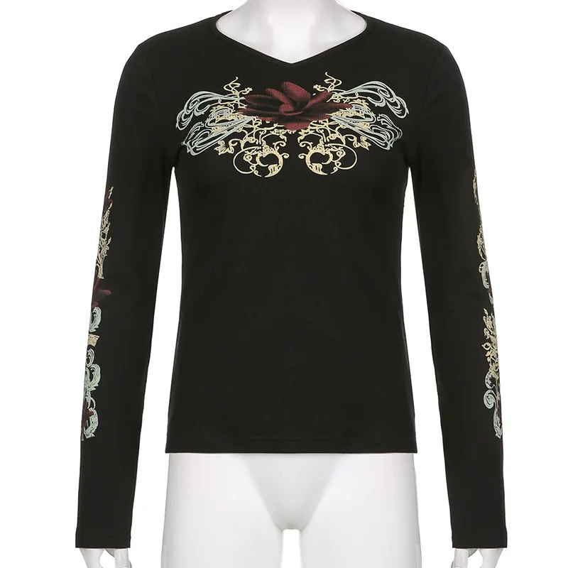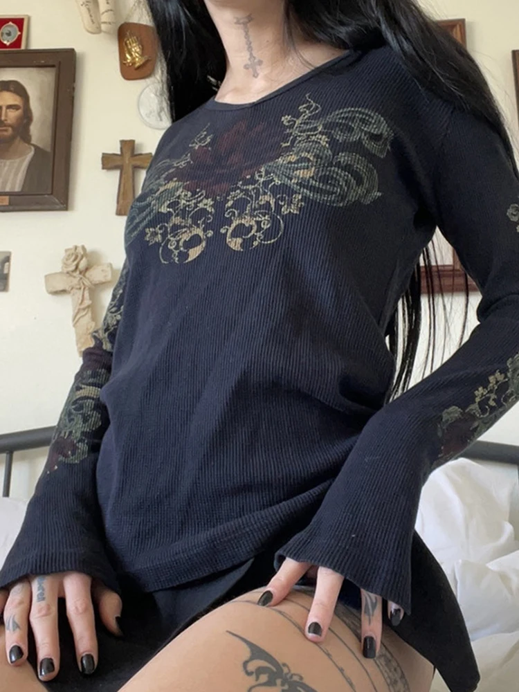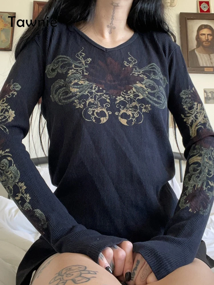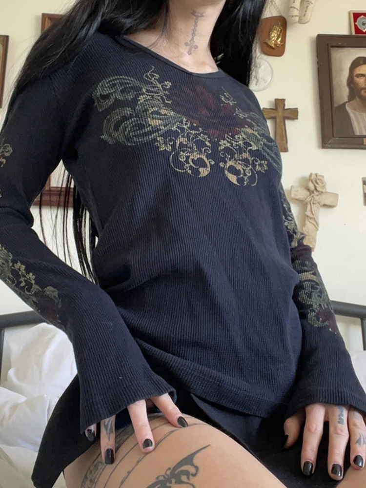Женские футболки Gitana 2022 с графическим принтом в стиле ретро, Осенние футболки с длинным рукавом, с изображением Феи гранж, облегающий Повседневный укороченный топ темной Академии