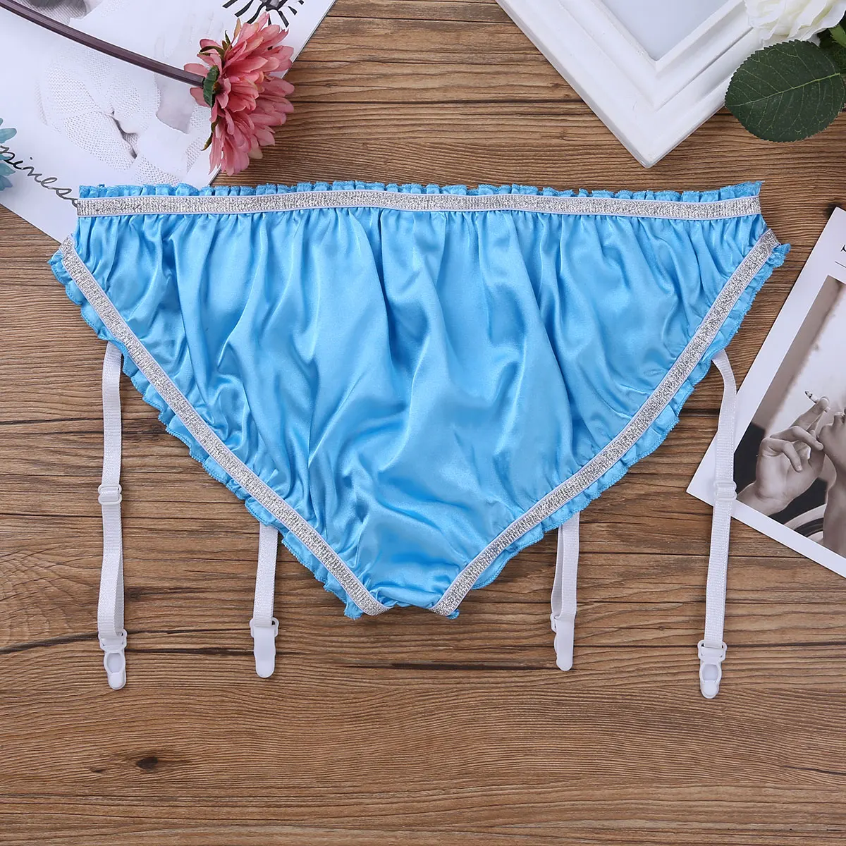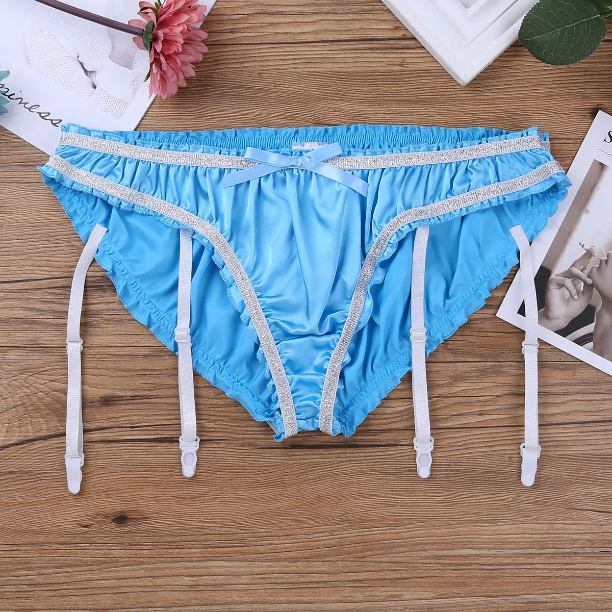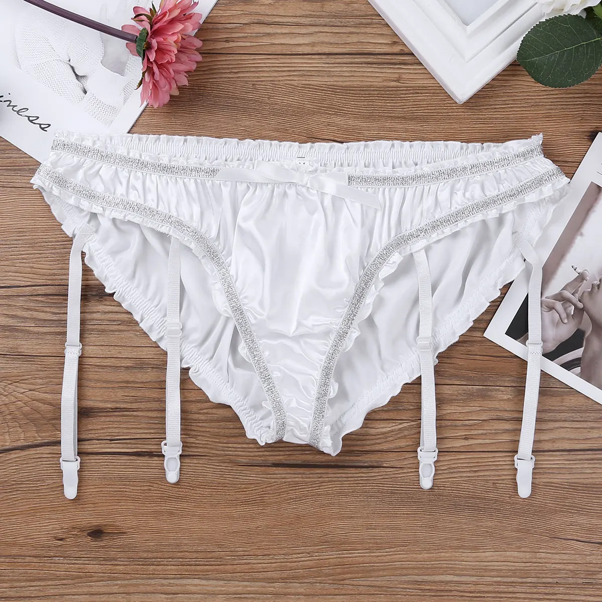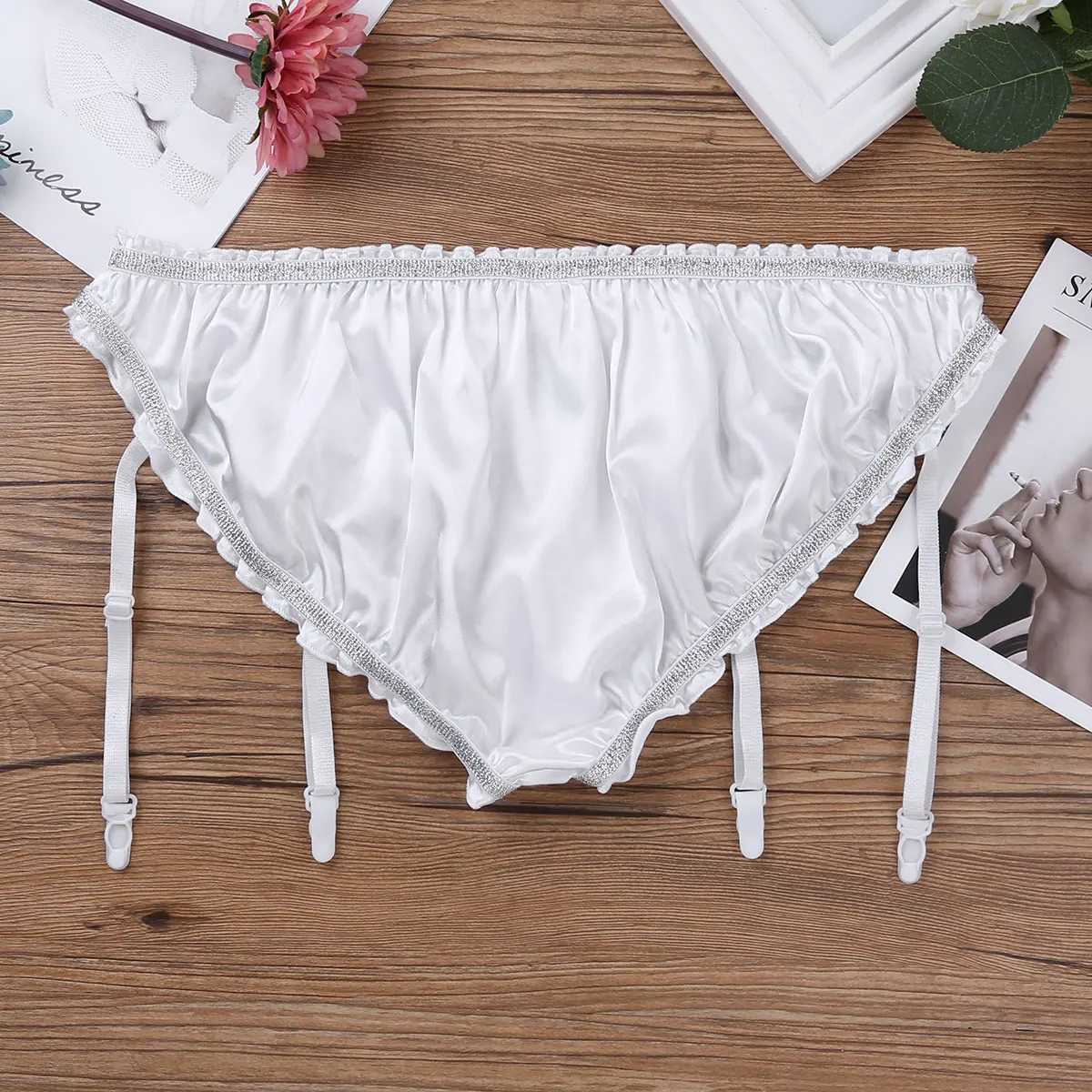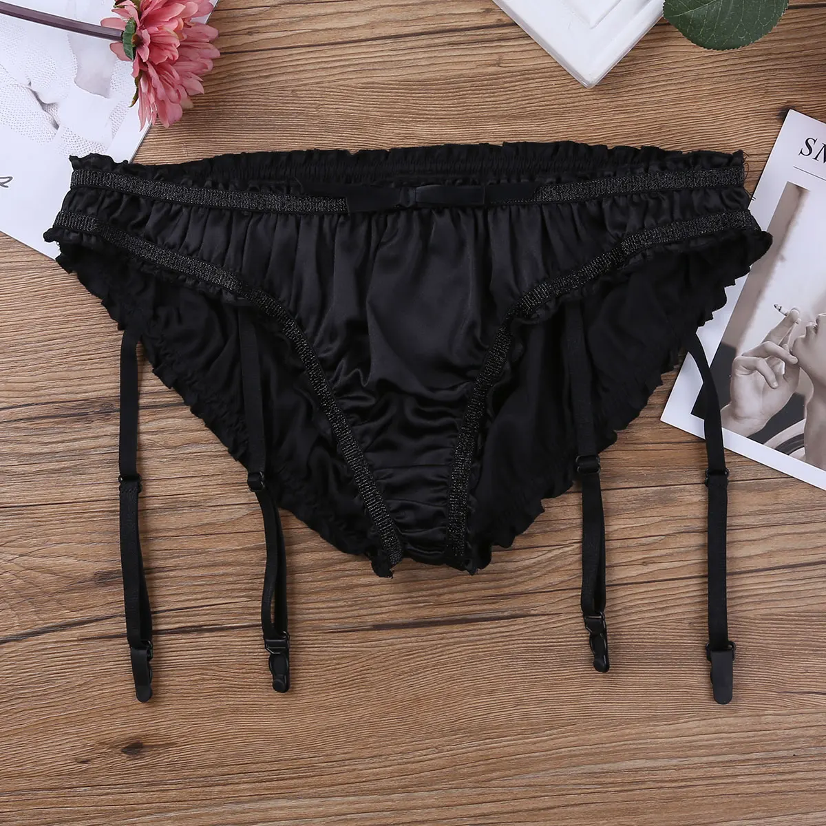 Мужское сексуальное нижнее белье, блестящие атласные трусики с оборками и рюшами, брифы, нижнее белье, эротические трусы с подвязками