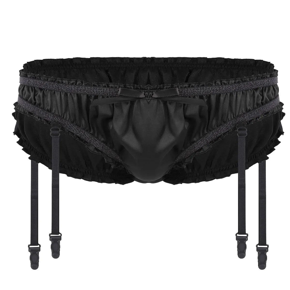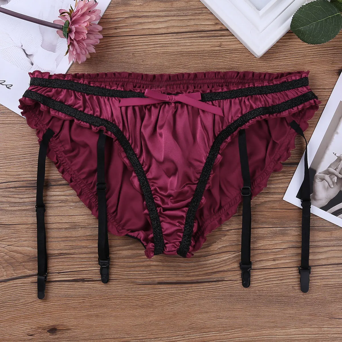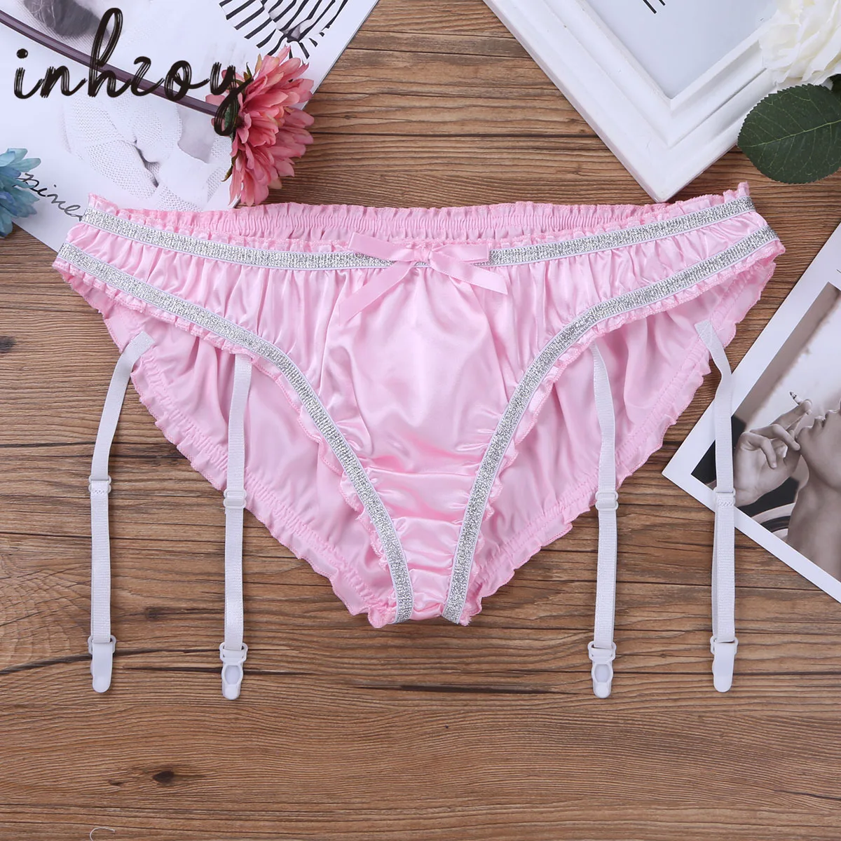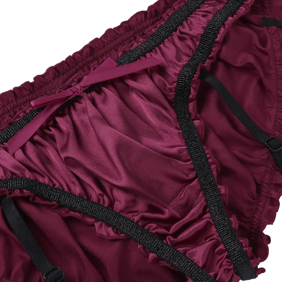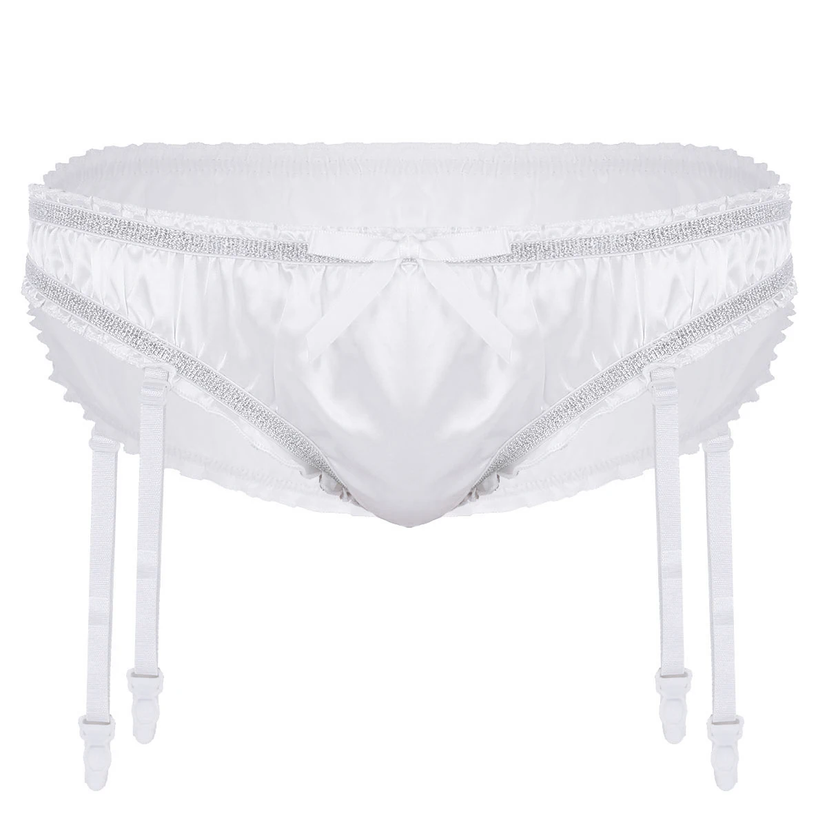 Мужское сексуальное нижнее белье, блестящие атласные трусики с оборками и рюшами, брифы, нижнее белье, эротические трусы с подвязками