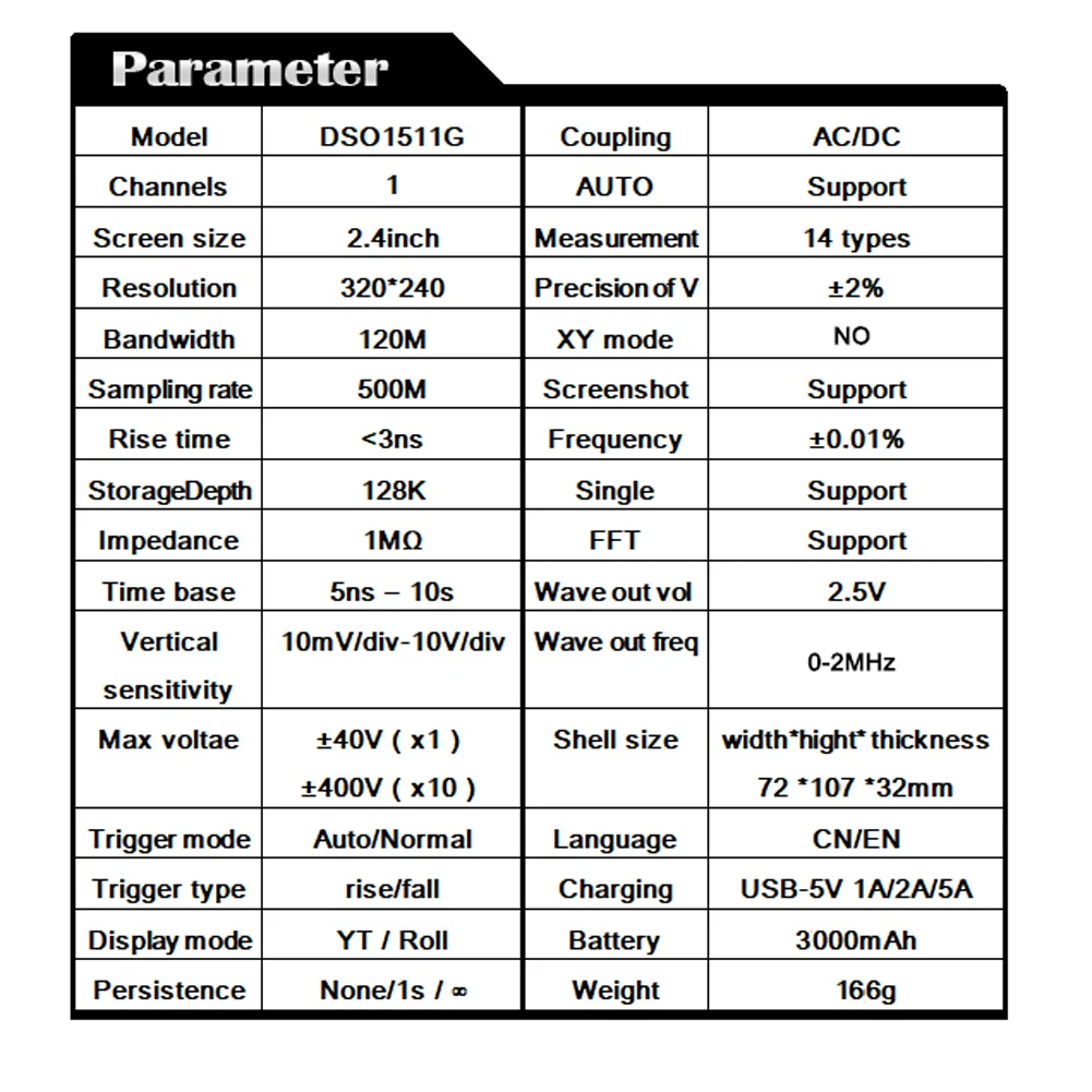 Это своего рода качественный осциллограф с пропускной способностью 120 м и частотой дискретизации 500 м, более стабильный и с более высокими осадками. 14 доступных вариантов измерения, частота, пики-пики, рабочий цикл, амплитуда, RMS, средняя, период, + ширина импульса,-ширина импульса, Макс, мин, верх, основание,-Рабочий цикл. Поддержка переключателя выходного сигнала: Синусоидальная волна, квадратная волна, треугольная волна и т. д. Широкое применение на mcu отладки, ремонт автомобилей, Ремонт бытовой техники, DIY электронная конкуренция, отладка питания, инвертор и т. Д. Вы можете попробовать.Особенности:Разрешение:Оснащен цветным дисплеем с разрешением 320*240, с яркими цветами и высокой контрастностью, вы можете четко видеть данные.Пропускная способность и частота выборки:С пропускной способностью 120 м и частотой дискретизации 500 м, более стабильной и с более высокими осадками.Высокая пропускная способность:Полоса пропускания до 120 м может легко справиться с измерительными тестами в различных областях.Доступно 14 вариантов измерения:Частота, пики-пики, рабочий цикл, амплитуда, RMS, средняя, период, + ширина импульса,-ширина импульса, Макс, мин, верх, основание,-рабочий цикл.Поддержка переключателя выходного сигнала: Синусоидальная волна, квадратная волна, треугольная волна и т. д.FFT:FFT используется для преобразования сигналов временной области в частотную область и широко используется в гармоническом анализа и других областях.Поддержка трех режимов отображения:Логарифмический, линейный и музыкальный спектр.Справочная форма сигнала:Вы можете измерить форму волны, зафиксировать форму тока на экране, и нормально обновленная Форма волны не будет зависеть. Эталонные формы сигнала полезны для одноканальных осциллографов. С эталонными волноводами вы можете легко сравнить формы сигналов двух каналов.Полный триггер:Режим Trig: автоматический/нормальный; Тип триггера: подъем/падение, уровень триггера: Руководство/АвтоВертикальная чувствительность и время основания:Вертикальная чувствительность области варьируется от 10 мВ/див до 10 В/див (1 диапазон). Временная база осциллографа составляет от 5 до 10 с.Сохранение формы волны:Один щелчок для сохранения формы сигнала экрана, а также поддержка удаления или просмотра скриншотов истории ..Подключение к ПК:Изображения скриншота могут быть экспортированы на компьютеры через usb-соединение.Видеовыход:3,5 мм для наушников внизу может выход AV видео Имитации Сигнала, который может быть подключен к ТВ или проектору.Источник питания:Встроенная перезаряжаемая литиевая батарея, 3,7 V, 3000mAh большой caparity, полностью заряжено может обеспечить длительное время работы.Компактный размер:Легкий и портативный, также может использоваться в качестве портативного инструмента для отладки на месте.Широкое применение:Подходит для mcu отладки, ремонта автомобилей, ремонта бытовой техники, DIY электронных соревнований, отладки питания, инвертора и т. д.Характеристики:Название: осциллографМодель: DSO1511GЦвет: желтый, зеленый(Опционально)Батарея: 1*2,5 V, 3000 мА/ч, Батарея(В комплекте)Каналы: 1Экран Размер: 2,4 дюймовИзмерение: 14 типовРазрешение: 320*240Полоса пропускания: 120 мЧастота дискретизации: 500 мВремя подъема: <3nsГлубина хранения: 128 кбитСопротивление: 1MΩБаза времени: 5ns-10sЧувствительность вер: 10 мВ/div-10V/ДивМаксимальная мощность: ± 40 В