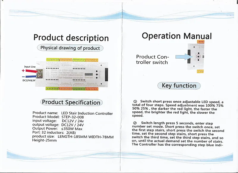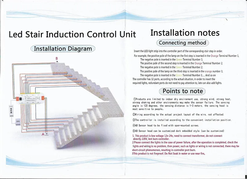1-датчики A/B должны быть установлены на входе и выходе из лестницы и лицом к телу человека.2-продукт низкого напряжения 12V-24V, подключите к сети питания трансформатор. Не подключайте напрямую 220 В, это сгорит контроллер.3. Изделие не является водонепроницаемым.