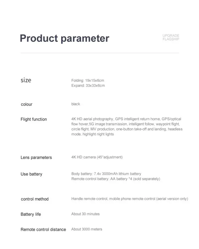 Основные функции: дистанционный складной GPS воздушный, БПЛА, бесщеточный двигатель, gps-позиционирование, ультра долгий полет, шесть проходов гироскопа, вверх и вниз, вперед и назад, левая и правая сторона полета, рулевое управление, одна кнопка возврата, безголовый режим, одна кнопка геомагнитной калибровки, одна кнопка горизонтальной калибровки, gps-переключатель, Разблокировка одной кнопкой, фото/видео, скоростная передача, возврат одной кнопкой, интеллектуальное слежение, объемное изображение одной кнопкой, траектория движения, Переключение режима начинающего движения, режим мВ, сплит-экран VR, фото/видео, управление приложением
