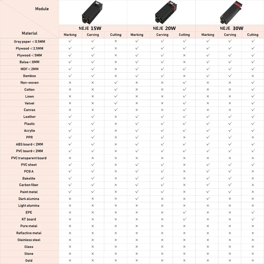 * Программное обеспечение: Программное обеспечение NEJE/приложение* Материнская плата: 2 MCUs (GD32 MCU + STC)* Мощность лазера: 20 Вт (вход лазера: 12 В 0,75 А) / 30 Вт/15 Вт (40 нм, для портретной гравировки)* Светящийся цвет: синий* Длина лазерной волны: 450нм* Формат изображения:.nc \. Dxf \. Bmp \. Jpg \. Png и т. Д.* Размер изображения: 2000*2000 пикселей/0,075 мм точечное расстояние* Система поддержки: Windows 7 (необходимо установить. Среда программного обеспечения net 4,8), Windows 8,1, Windows 10 и выше (не поддерживает windows XP )/ Macbook/iOS/ Android(NEJE wireless)* Напряжение питания машины: 12 В 2 АПредупреждение о безопасности: пожалуйста, примените этот модуль под предпосылкой безопасности!Изделия могут быть вырезаны, в том числе: оксид алюминия, красное дерево, бамбук, бумажные карты, кожа, легковоспламеняющийся пластик, печатная плата и т. д.Не выгравировать: металл/стекло/камень/керамика/нержавеющая сталь/светоотражающий материал/прозрачный материал
