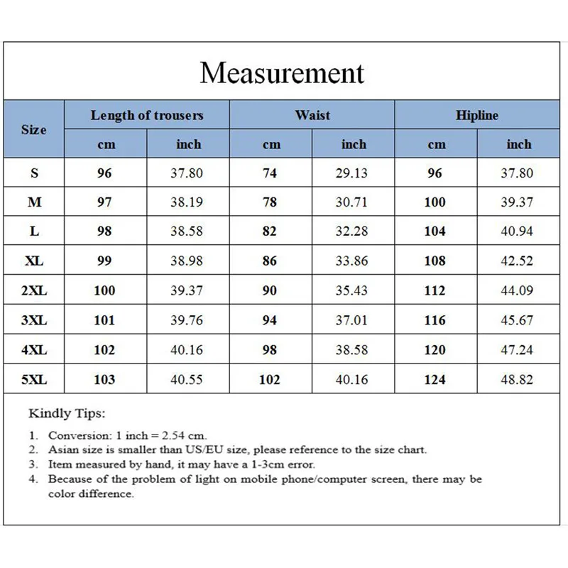 Размер: S,M,L,XL,2XL,3XL,4XL,5XL,Размер S, длина брюк: 96 см обхват талии: 74 см обхват бедер: 96 смРазмер M, длина брюк: 97 см обхват талии: 78 см обхват бедер: 100 смРазмер L, длина брюк: 98 см обхват талии: 82 см обхват бедер: 104 смРазмер XL, длина брюк: 99 см обхват талии: 86 см обхват бедер: 108 смРазмер 2XL, длина брюк: 100 см обхват талии: 90 см обхват бедер: 112 см