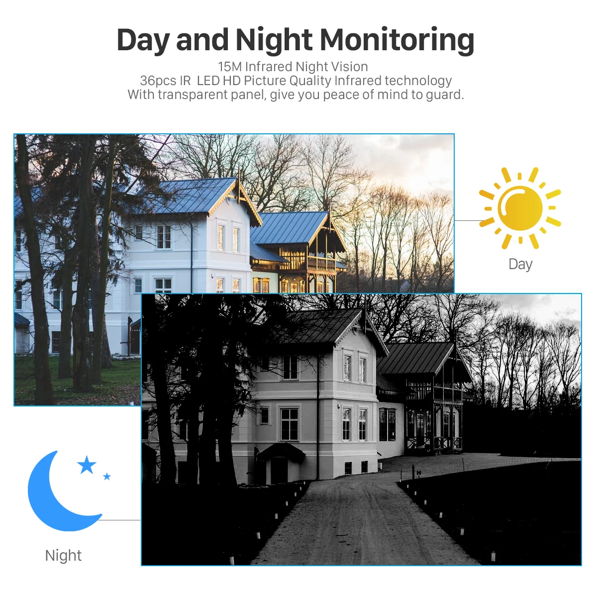 Встроенные 36 шт. двойные световые светодиоды;Отслеживайте движущиеся предметы, автоматически освещаемые. Это впечатляющее маленькое оружие для борьбы с проблемами.Камера может показать красочное видение ночью тоже, есть три режима ночного видения для вас на выбор.