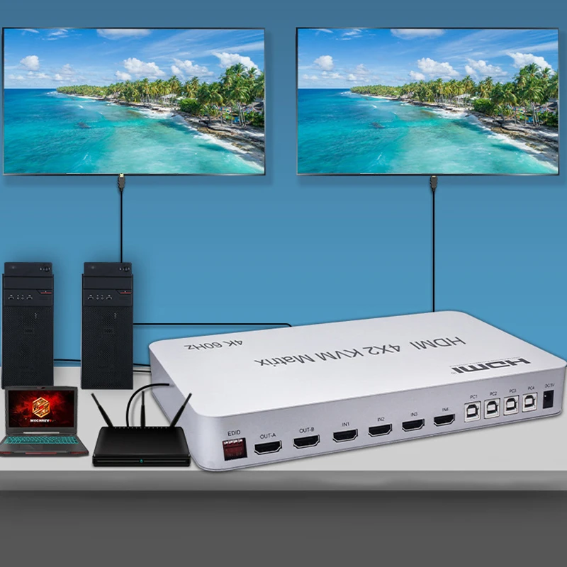 Примечания: 1) есть слишком много версий USB мыши и клавиатуры, мы не можем убедиться в совместимости, так что стандарт 104-ключ Проводная usb-клавиатура, стандартный 2 или 3 Кнопка Проводной USB мыши рекомендуются. 2) матричный коммутатор имеет ограниченную совместимость с механической клавиатурой/мышью, мы не рекомендуем использовать с этими механическими версиями. 3) Премиум HDMI Сертифицированный HDMI 2,0 кабель действительно необходим для работы с нашим товаром. 4) есть тысячи источников видео и дисплеев различных брендов и производителей, нет ни одного элемента, который может поддерживать все модели. 5) Если возникнут какие-либо проблемы, пожалуйста, свяжитесь с нами для того, чтобы снять проблемы, вместо того чтобы открывать спор или оставлять негативные отзывы. 6) Наша матрица 4x2 KVM полностью протестирована перед доставкой, покупайте с уверенностью! Описание: Абсолютно новый и высококачественный, полностью протестирован, покупайте с уверенностью! Матрица HDMI 4x2 KVM позволяет отображать 4 источника HDMI на 2 HD клеммах с оптическим волокном Или стерео выход для наушников. Два набора мыши и клавиатуры могут управлять устройствами до 4 портов ПК. Матрица позволяет переключать или разбивать четыре устройства HDMI на два совместимых монитора или проекторы HDMI. И любые выходные порты могут осуществлять независимый аудиовыход с помощью оптического волокна или стереонаушников. Наши устройства предлагают решения для шума, пространства и безопасности, управления центром обработки данных, распространения информации, Презентация конференц-зала, школьная и корпоративная среда обучения.