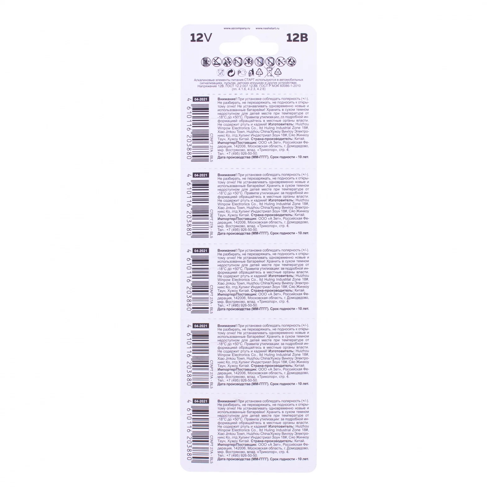 • Благодаря специальной конструкции и технологии батарейки СТАРТ 27А являются безопасными. Корпус герметичен. Исключены перегрев и замыкание.
