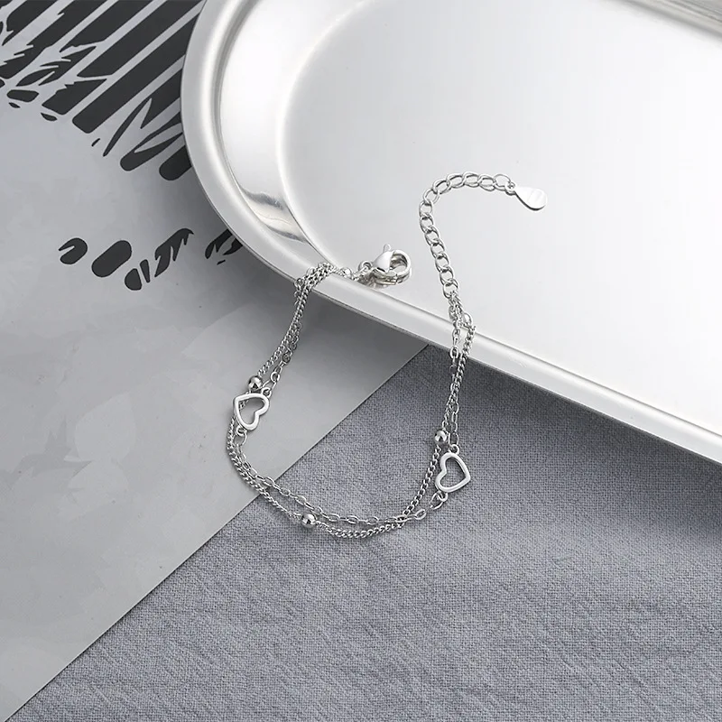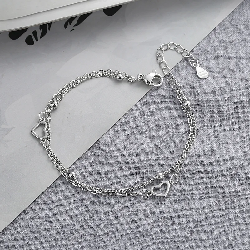 VOQ Серебряный двойной полый круглый браслет с бусинами сердце Женская милая цепочка студенческий индивидуальный браслет