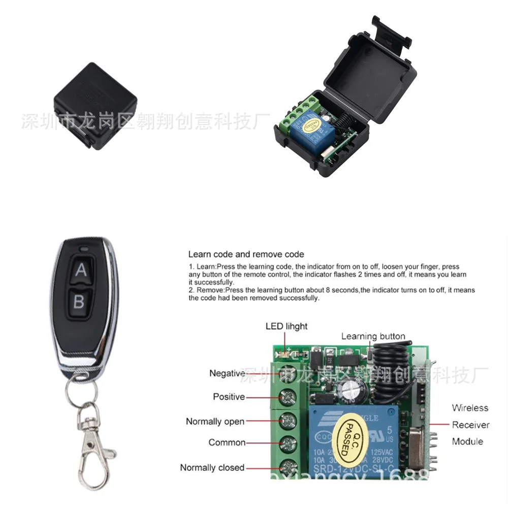 Особенности:Дистанционное программирование -Четкий Код: Нажмите кнопку обучения на приемнике 8 раз, и пароль будет сброшен. После очистки кода вам нужно будет повторно использовать пульт дистанционного управления. -Мгновенный режим-Узнать код: (переключатель-Нажмите кнопку дистанционного управления, чтобы открыть его, а затем нажмите его снова, чтобы закрыть его.)Нажмите кнопку обучения на приемнике дважды, подождите немного, светодиодный индикатор выпустится и войдет в режим обучения. -Нажмите клавишу обучения на приемник 3 раза, и светодиодный (на приемнике) мигнет 3 раза.Когда светодиодный индикатор загорится, нажмите кнопку на пульте дистанционного управления (чтобы научиться) и нажмите кнопку A пульта дистанционного управления, и светодиодный индикатор мигает 3 раза.Нажмите кнопку B пульта дистанционного управления, и светодиодный индикатор мигает 3 раза.Через 3 секунды светодиодный индикатор погаснет, что указывает на успешность обучения.