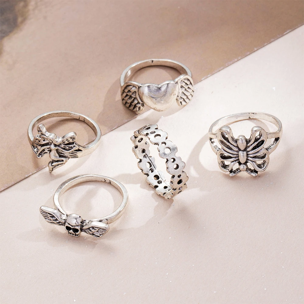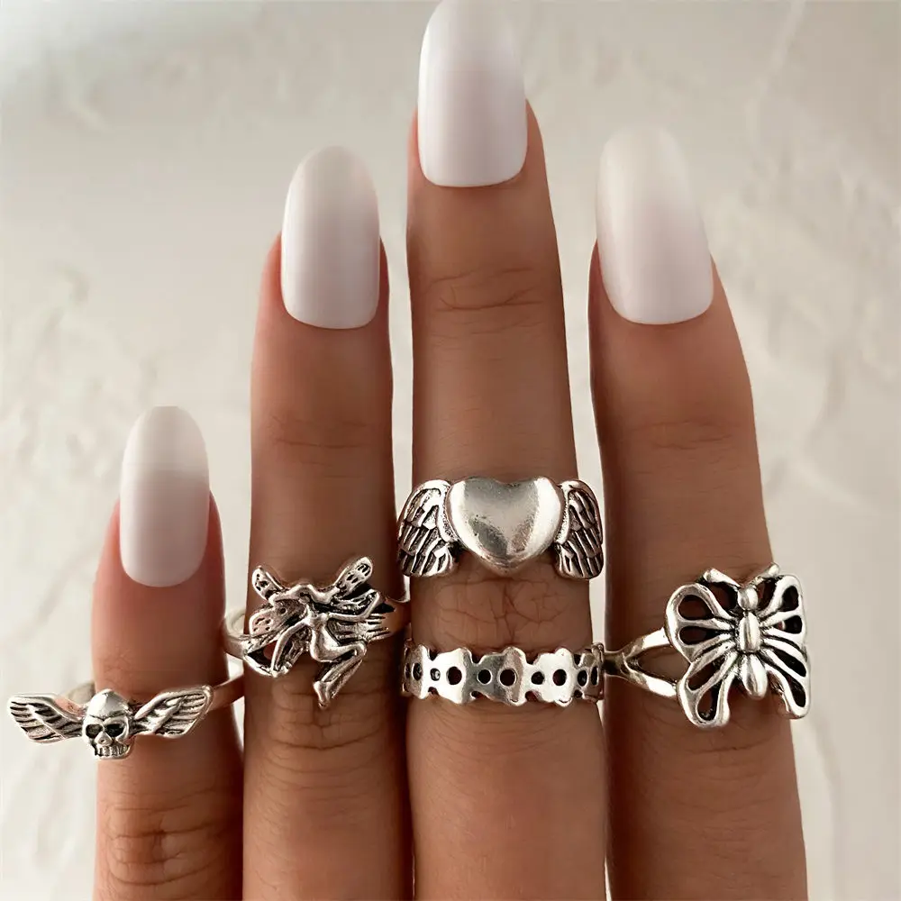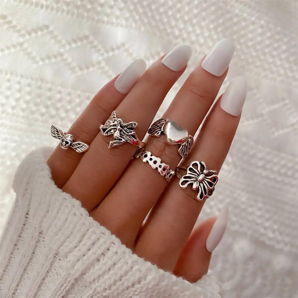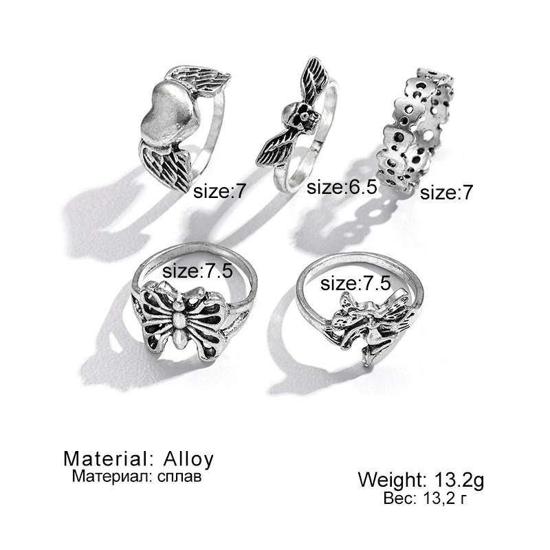 Панк Готический Серебряный Цвет Бабочка Палец Кольцо Набор для Женщин 6 ШТ.Крыло Сердца Крылья Ангела Амур Подвески Кольца Ювелирные Изделия Anillos