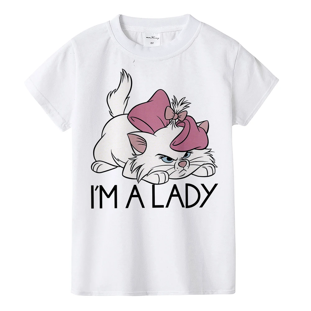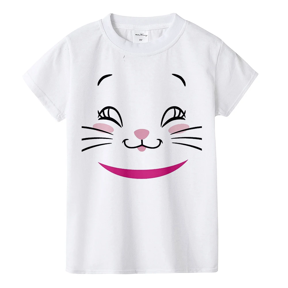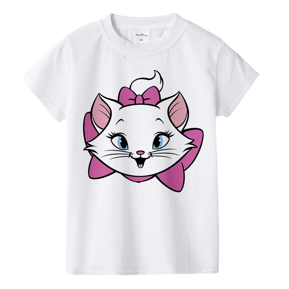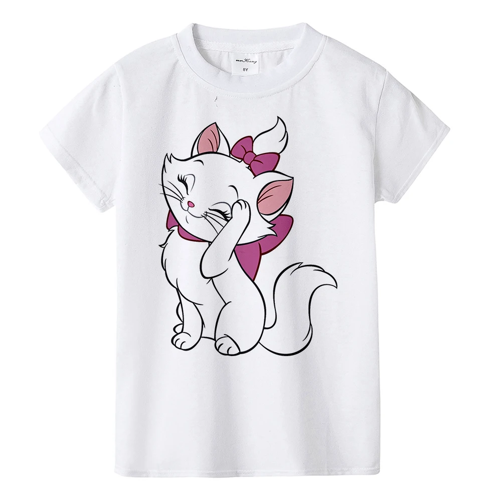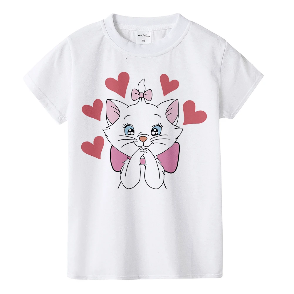2021 красивая футболка для девочек, летняя футболка с мультяшным принтом Мари-кота, Детская футболка с милым розовым узором, рубашка с круглым вырезом и мультяшным принтом