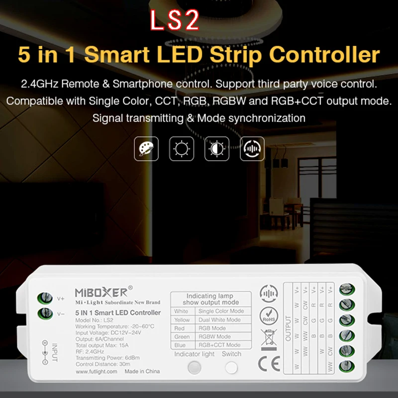 Название продукта: умный светодиодный контроллер 5 в 1Номер модели: LS2Рабочее напряжение: 12 В ~ 24 ВРабочая температура: -20 ~ 60 ℃Выход: 6А/каналОбщий выход Макс: 15аRF: 2,4 ГГцМощность передачи: 6 дБмДистанция управления: 30 мПодключение: общий анод