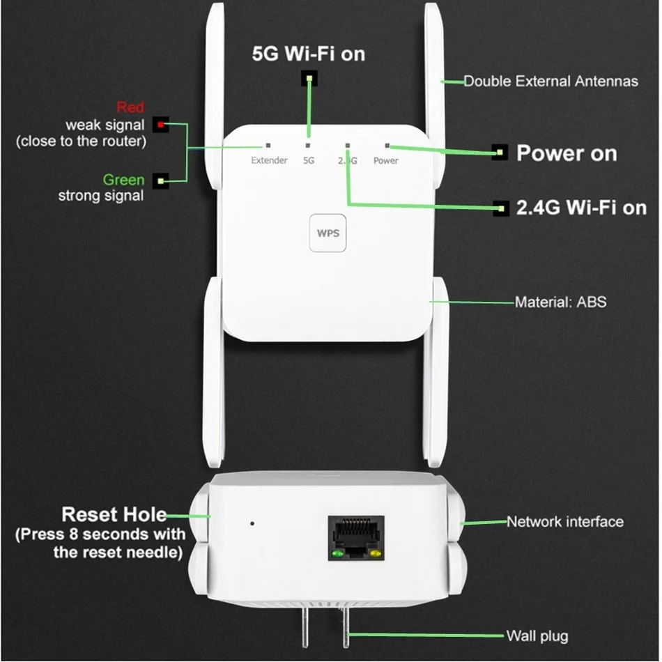 【 Сверхвысокая скорость 1200 Мбит/с и сверхстабильная стабильность: двухдиапазонный (300 Мбит/с для 2,4 ГГц, до 867 Мбит/с для 5 ГГц) и общая скорость 1200 Мбит/с, новейшие технологии позволяют вам работать в Интернете, смотреть видео, играть в игры и видео общаться в любом месте дома без прерывания работы.【 4 антенны с высоким коэффициентом усиления и полное покрытие сигнала на 360 ° 】 ретранслятор Wi-Fi оснащен 4 внешними антеннами с высоким коэффициентом усиления, которые улучшают радиус действия Вашего существующего покрытия Wi-Fi, увеличивают беспроводной сигнал примерно на 10 метров!【Универсальная совместимость и обслуживание клиентов 】 работает с беспроводным Интернет-роутером 802.11b/g/n/a/ac, подходит для большинства роутеров или шлюзов на рынке. Поддержка расширения на любые устройства, такие как ios, устройства android, устройства samsung, устройства echo/alexa, ПК, playstation, smart Plug и многое другое.【Быстрая Настройка и безопасный сетевой аксессуар с помощью кнопки WPS вы можете запустить расширитель в рабочем режиме в течение 5 секунд, как это просто! Вы можете следить за маннуалом, чтобы настроить ретранслятор