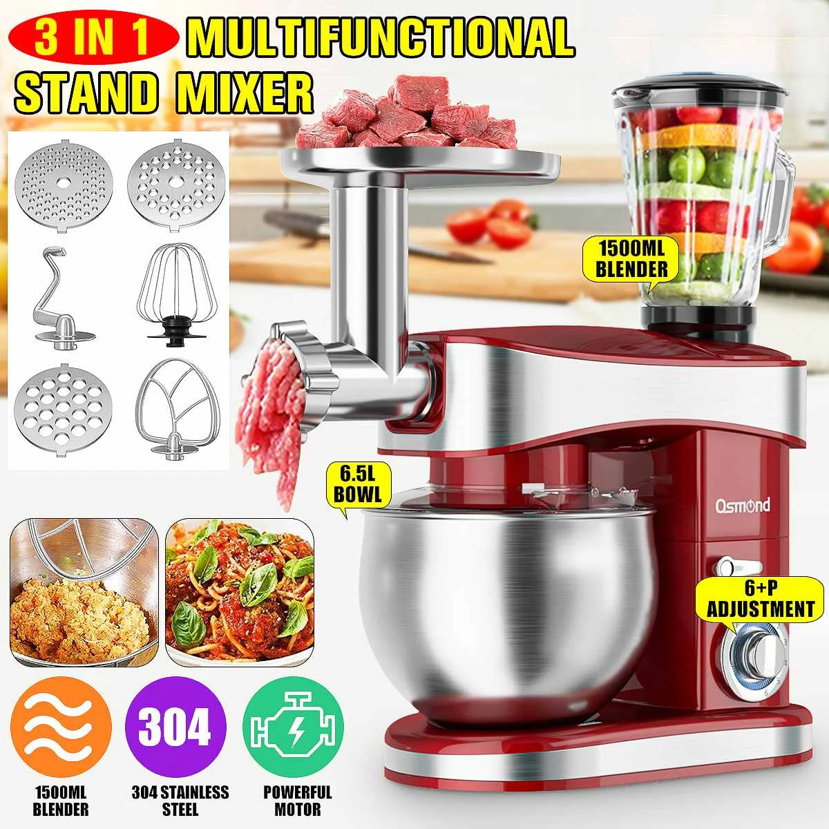 Посылка включает в себя:1x хост-машина1x крюк для теста1х плоская тарелка1 венчик1 шпатель1x мясорубка1x пищевой стеклянный блендер1x 6. 5л чаша из нержавеющей стали1х чехол-накладка1x Инструкция по эксплуатации на английском языке1 комплект колбас и киббеСпецификация:Цвет (вариант): серебристый/красныйМодель: SC-213cМощность: 1200 ВтМатериал: 304 нержавеющая сталь + пищевое стекло + АБС экологически чистый пластикСтандарт штепсельной вилки: штепсельная вилка европейского стандартаНапряжение: 220-240 В 50 ГцЕмкость чаши из нержавеющей стали 304: 6,5л/219,8 унцийЕмкость блендера: 1500 мл (около 5-6 чашек)Размер хост-машины (Д * Ш * В): около 36,6 см * 15 см * 32 см/14 "* 6" * 12,6"304 Размер чаши из нержавеющей стали (Д * В): около 21 см * 16 см/8,3 "* 6,3"Размер блендера (Д * В): около 16 см * 23 см/6,3 "* 9,1"Примечание:1) обратите внимание, что этот товар подходит для зоны 220-240 В/50-60 Гц, мы отправим подходящий адаптер.2) крюки для теста и лопатка для взбивания выполнены из алюминиевый сплав, они светильник и крепкий, но нельзя мыть в посудомоечной машине. Нагрев в посудомоечной машине приведет к коррозии гальванического покрытия посуды.3) чаша и проволочный плит изготовлены из нержавеющей стали, безопасны для мытья.4) посуда хорошо сделана и очень прочная, просто убедитесь, что при установке вы выровняете фитинг с коннектором и закрутите, чтобы закрепить его перед использованием.