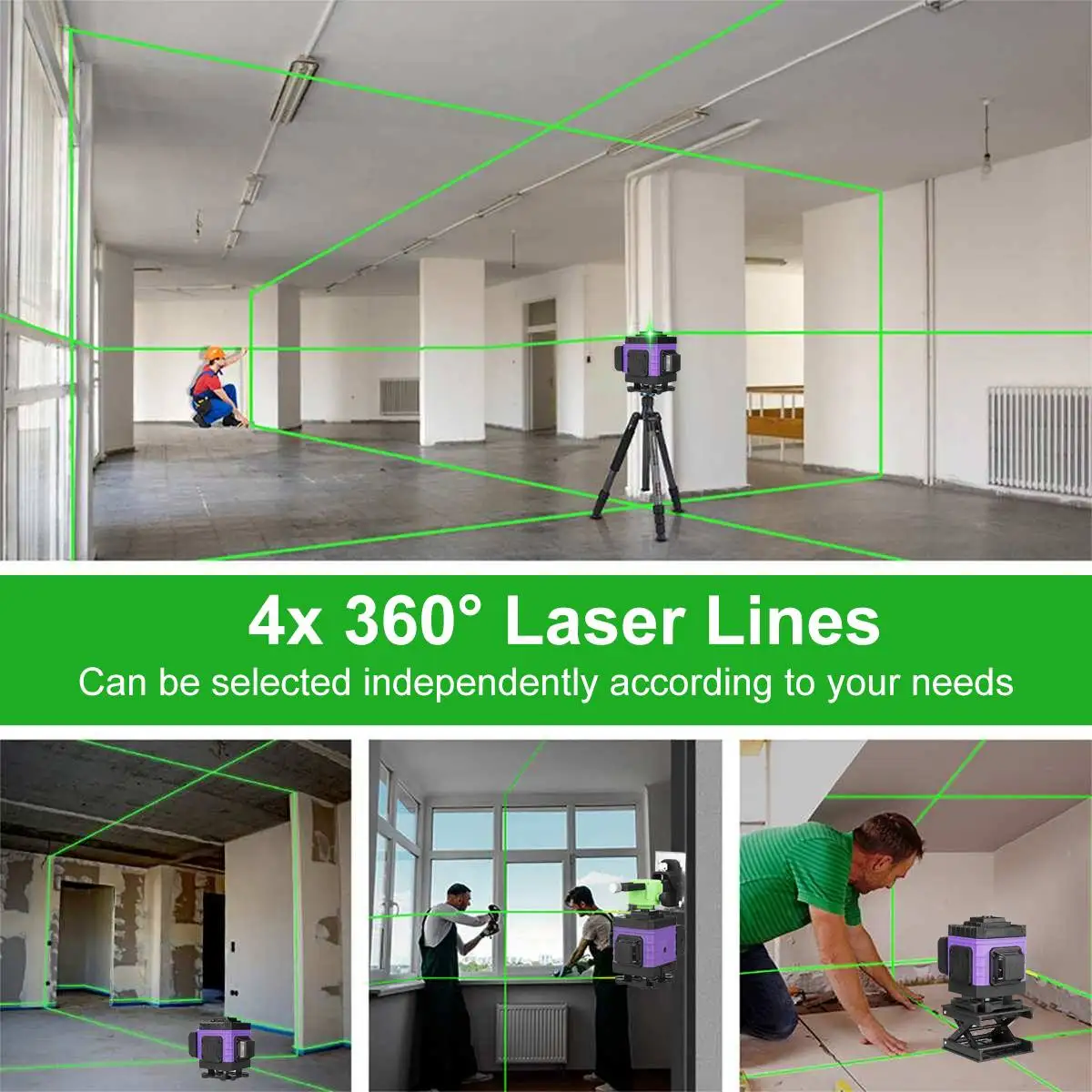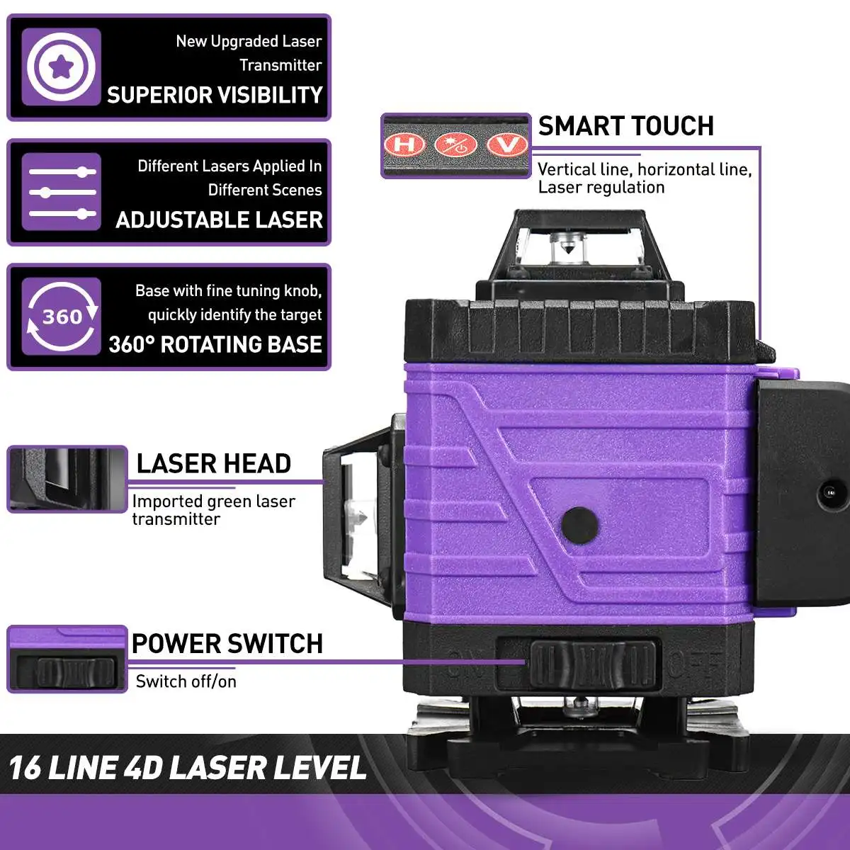 Лазерный уровень 4D, 16 линий, зеленый лазер, 360 горизонтальных и вертикальных перекрестных линий с автовыравниванием, супермощный, для использования в помещении и на улице