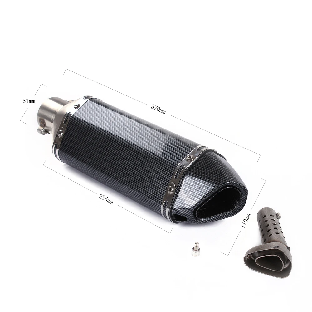Это универсальная Модифицированная выхлопная труба мотоцикла, она подходит для моделей мотоциклов калибра 51 мм (с адаптером 36-51 мм). Этот продукт был изготовлен из высококачественной нержавеющей стали и Украшен узором из углеродного волокна. Отличное качество изготовления и хорошая текстура. Для очень немногих моделей установка может потребовать простой сварки и сборки.